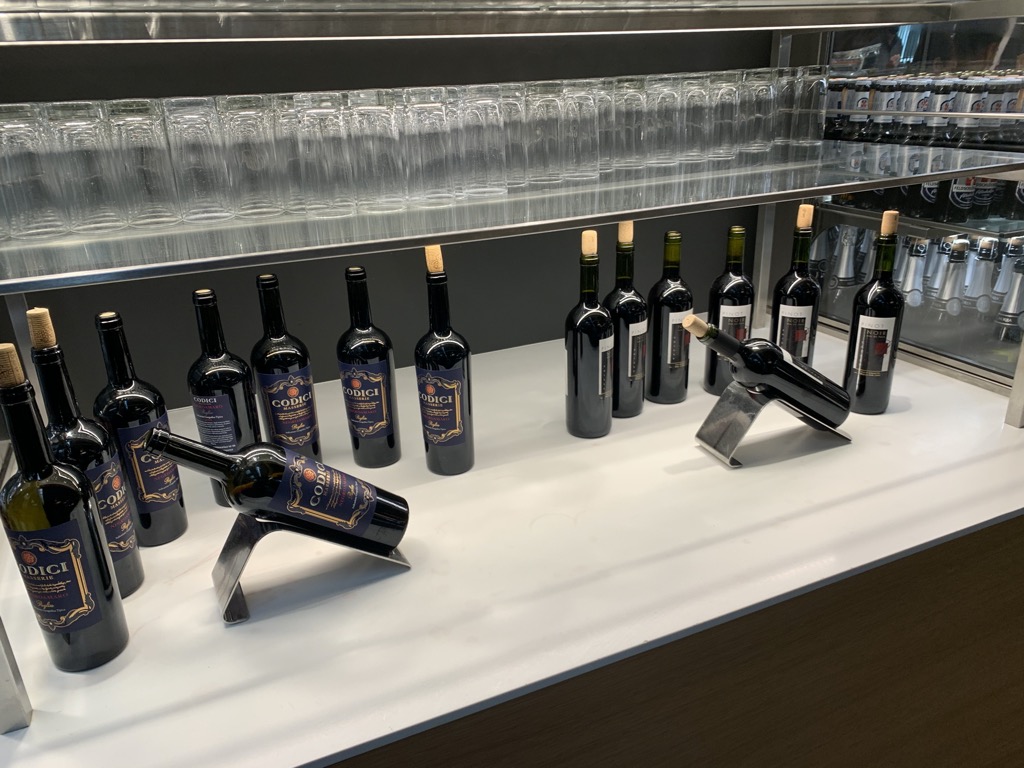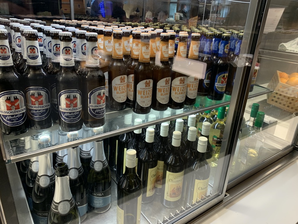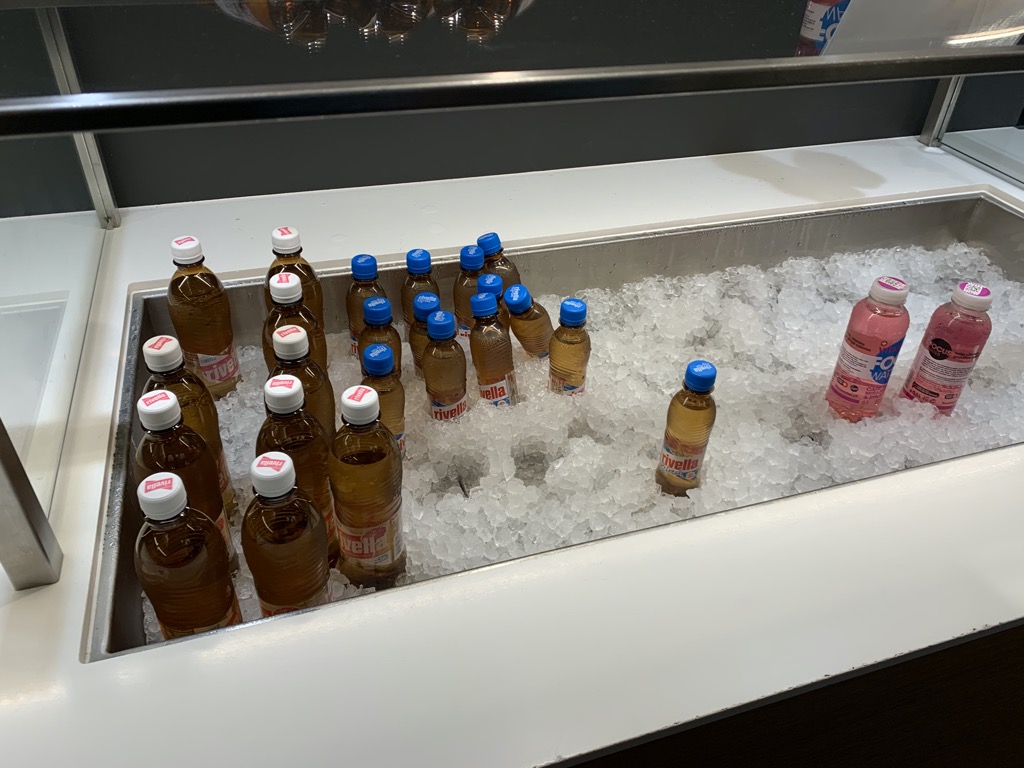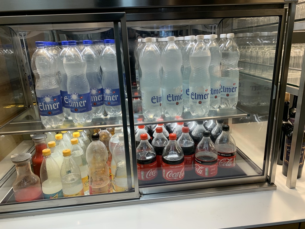 Im hinteren Bereich der Lounge war eine kleine Bar aufgebaut, an der allerlei ungekühlte Getränke standen, aber leider keine Gläser. Limonade und Cola kann man noch recht gut aus der Flasche trinken, bei 1L Wasser oder Wein wird das schon schwieriger. Es schien auch ein Platz für die Gläser vorgesehen zu sein, leider wurden sie erst am Ende unseres fast zweistündigen Aufenthaltes aufgefüllt. Auch das Geschirr, was teils noch von den vorherigen Gästen an den Couchtischen stand, haben wir selbst zur Seite geräumt. Während unseres Aufenthaltes wurde einmal benutztes Geschirr eingesammelt – das ist definitiv zu selten.