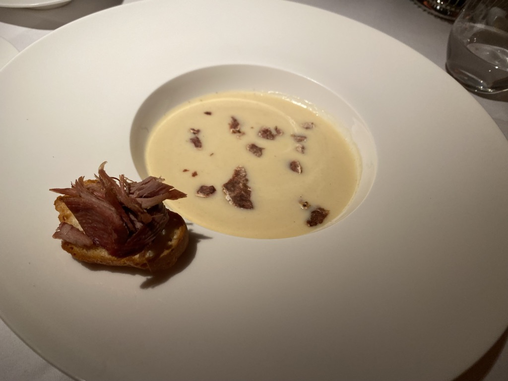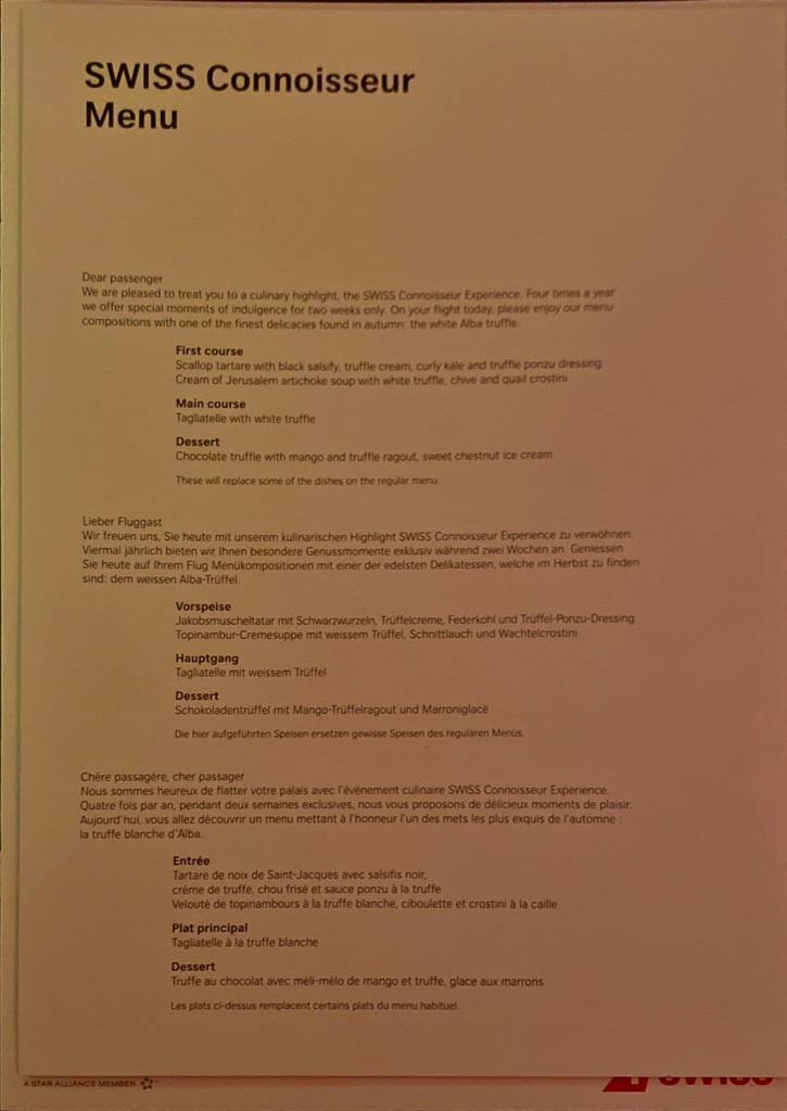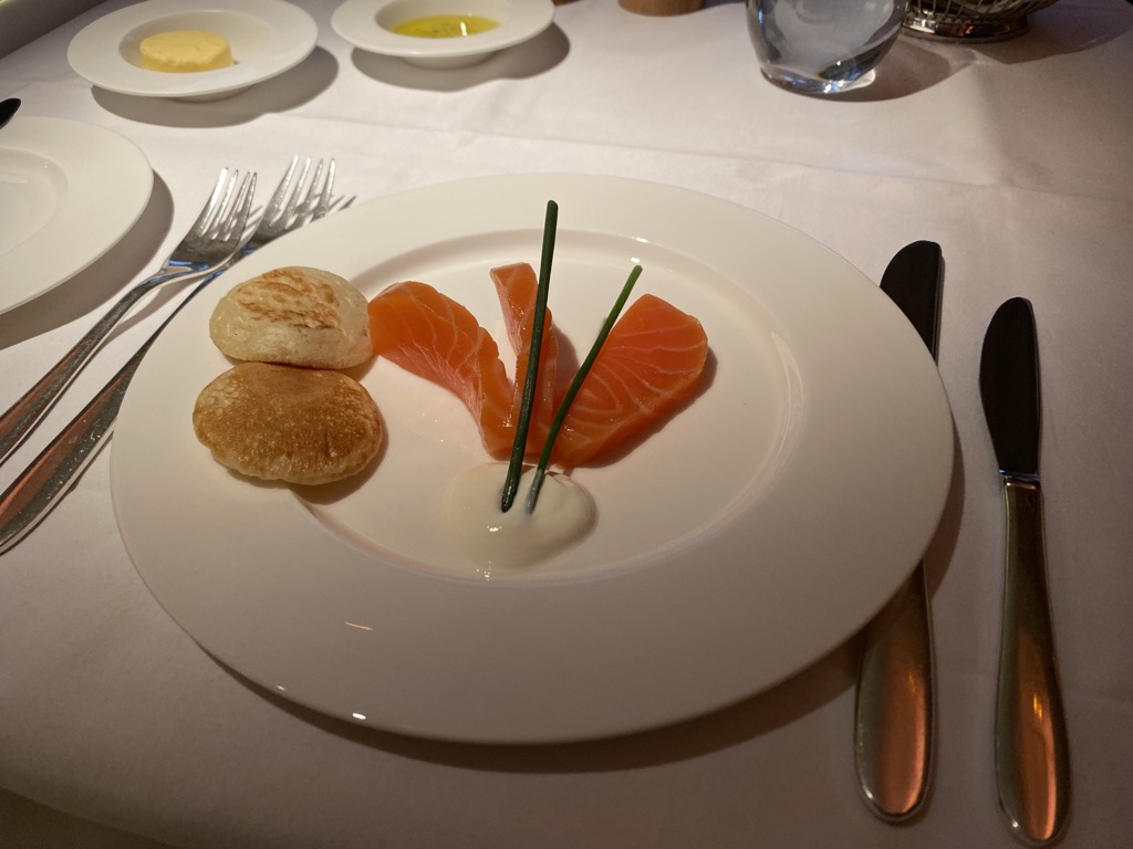 Wie bei Swiss üblich, startet das Menü immer mit Balik Lachs, welcher qualitativ auch diesmal sehr gut war. Weiter ging es bei mir mit einem frischen Salat und dem Swiss Connoisseur Menü. Hier wurde zu Beginn ein Jakobsmuscheltatar gereicht, worauf eine Suppe folgte. Beides hat uns beiden sehr gut geschmeckt.