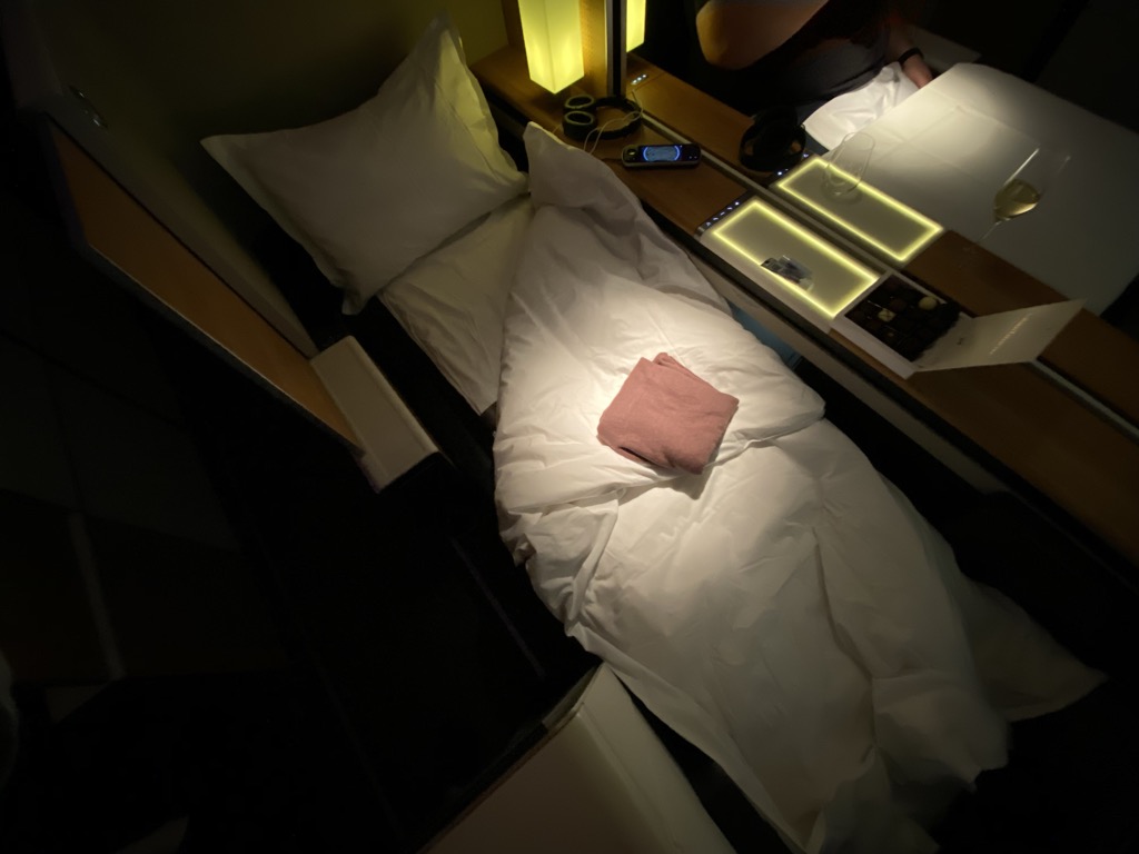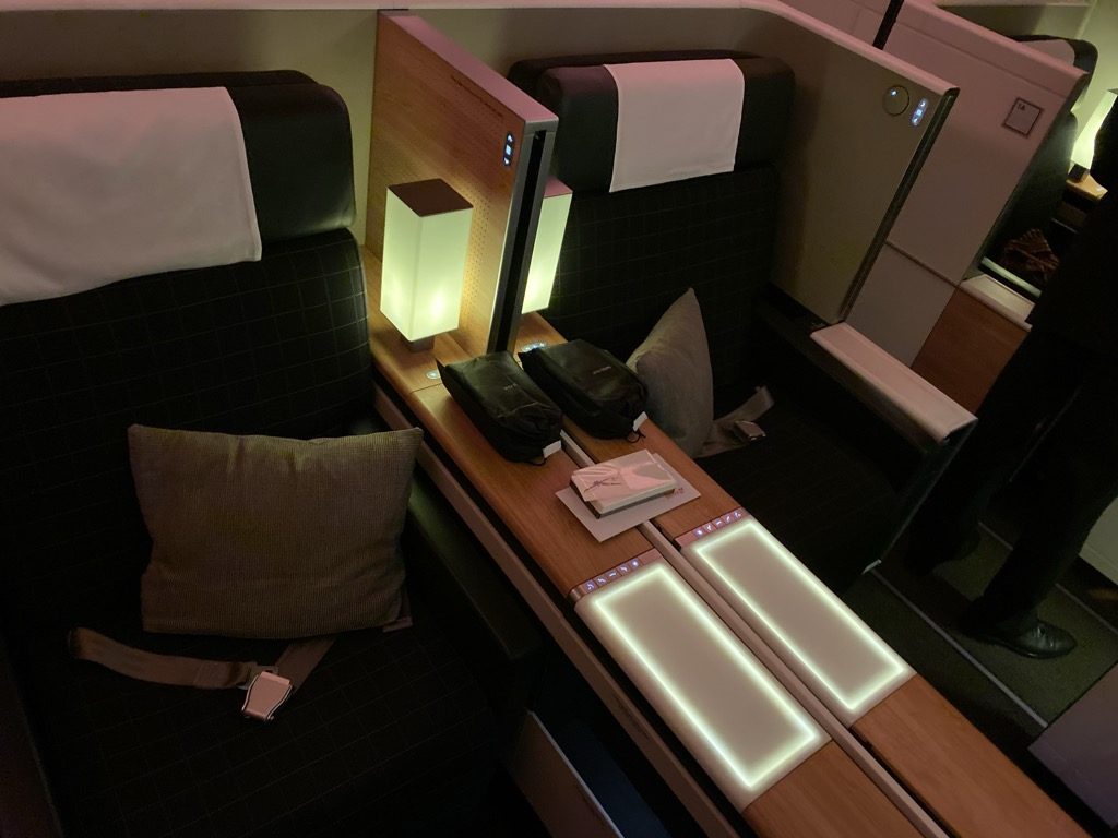Jeder der acht Sitze ist hierbei eine „halbe“ Suite. Man kann sich extrem gut vom Rest der Kabine abschirmen, allerdings ist es keine komplett schulterhoch verschlossene Suite. Wir fanden die Möglichkeit für den Nachtflug und die volle Kabine toll! Neben dem schlichten, aber sehr schön gestalteten First Class Sitz verfügt jeder Platz noch über einen Ottomanen, welcher auch mit eigenem Sicherheitsgurt ausgestattet ist. Zusammenreisende Personen können dann wie im Restaurant gegenüber sitzend essen.