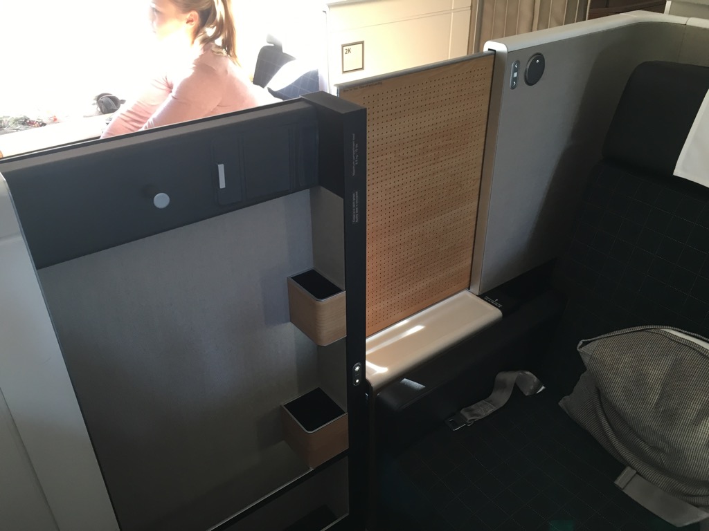 Jeder der acht First Class Sitze verfügt zudem über eine eigene Garderobe, mit genügend Stauraum. Hier ist neben den unterschiedlichen Ablagefächern auch ein Schminkspiegel verbaut. In der Armlehne, welche zum Gang hin ging, gab es zudem noch ein Fach für Schuhe.