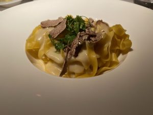 Beim Hauptgang hat Christoph sich für das Rindsfilet entschieden, welches wirklich on Point war! Nicht so einfach in einem Flugzeug vorgegartes Essen so perfekt zuzubereiten. Ich wählte die Trüffelpasta. Bei Pasta kann ich generell schon nicht Nein sagen, wenn das dann mit Trüffel zusammentrifft, ist die Auswahl getroffen.
