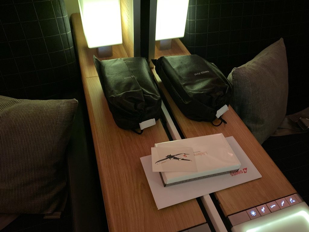 Wir wurden bereits zu Beginn des Fluges sehr herzlich begrüßt und diese Stimmung zog sich durch den gesamten Flug. Bei Swiss hatten wir wirklich noch keine negativen Erfahrungen mit Crews! Kurz nachdem wir an den Plätzen ankamen, erwartete uns eine kleine Überraschung. Auf der Mittelkonsole wartete ein Päckchen Pralinen und ein Umschlag auf uns. Im ersten Moment hatte ich Christoph in Verdacht, dass er den Flug zu meinem Geburtstag bei Swiss angekündigt hat und dies ein kleines Vor-Geburtstagsgeschenk ist. Christoph versicherte mir immer wieder, dass er selbst überrascht sei und damit nichts zu tun hätte.