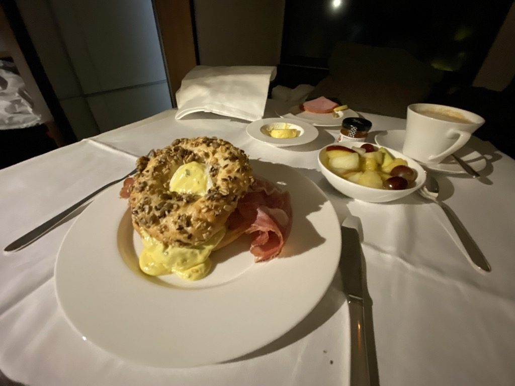 Kurz vor der Landung und nach dem Schlafen frühstückte Christoph noch eine Kleinigkeit, ich verzichtete, da ich absolut noch keinen Hunger hatte. Auch hier war Christoph mit dem Gebotenen sehr zufrieden.