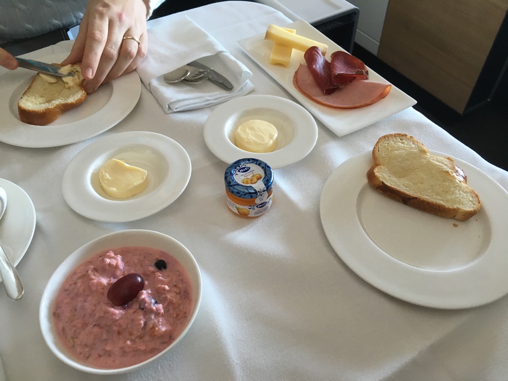 Swiss bringt in der First Class auf einem Tablett eine große Auswahl an kalten Frühstücksoptionen an den Tisch, von welchen man wählen kann. Neben Wurst, Käse, Marmelade, Jogurt und Müsli gibt es natürlich auch typisch Schweiz, Bircher Müsli.