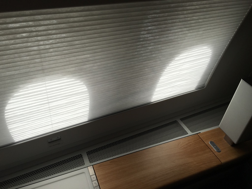 Was in der Swiss First Class der Boeing 777 neu ist, sind die elektronischen Fensterblenden. Wie man es aus Privatjets kennt, oder auch aus anderen First Class Produkten, wie bei Lufthansa, lassen sich alle drei Fenster eines jeden Sitzes auf Knopfdruck verdunkeln. Dieses System hat allerdings auch seine Tücken, so hat man versehentlich während des Fluges einmal alle Fensterblenden aus der Galley heraus geöffnet, woraufhin die Kabine taghell war und alle Passagiere wach.