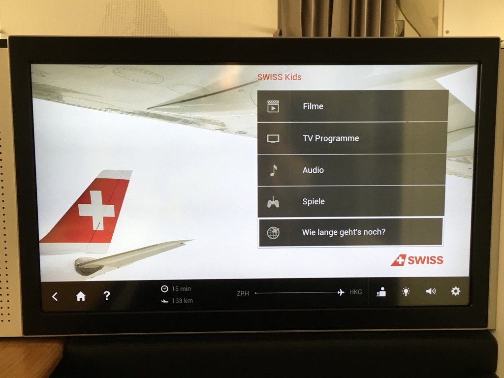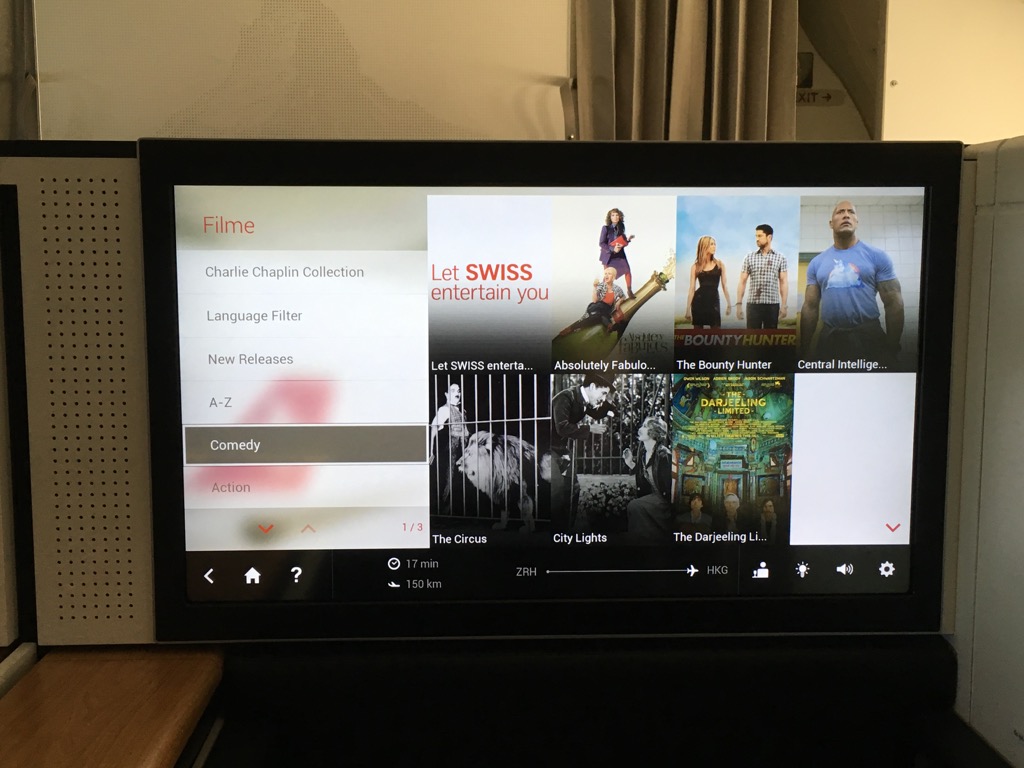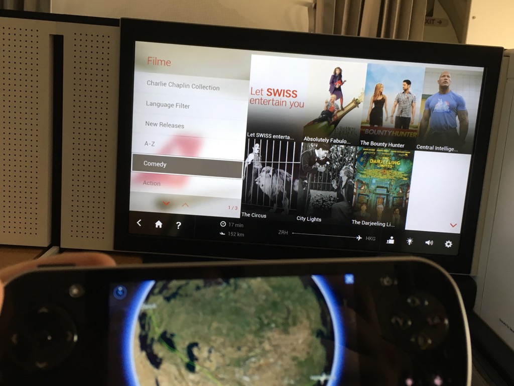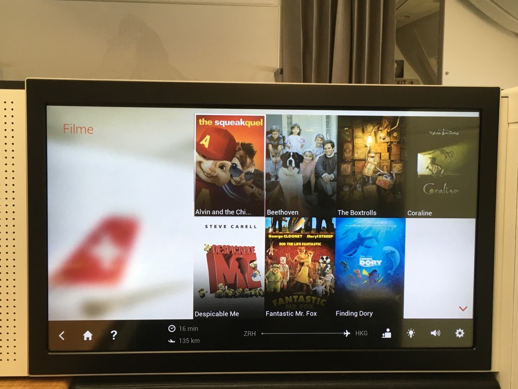 Der Swiss First Class Sitz verfügt über einen riesigen IFE Bildschirm. Dieser lässt sich über eine Touchscreenfernbedienung bedienen. Die Auswahl an Filmen, Serien, Musik und Spielen ist wirklich umfangreich. Allerdings habe ich das IFE auf diesem Nachtflug nicht genutzt. Positiv ist mir allerdings aufgefallen, dass man auf der Fernbedienung die Karte einblenden kann, während man einen Film schaut.