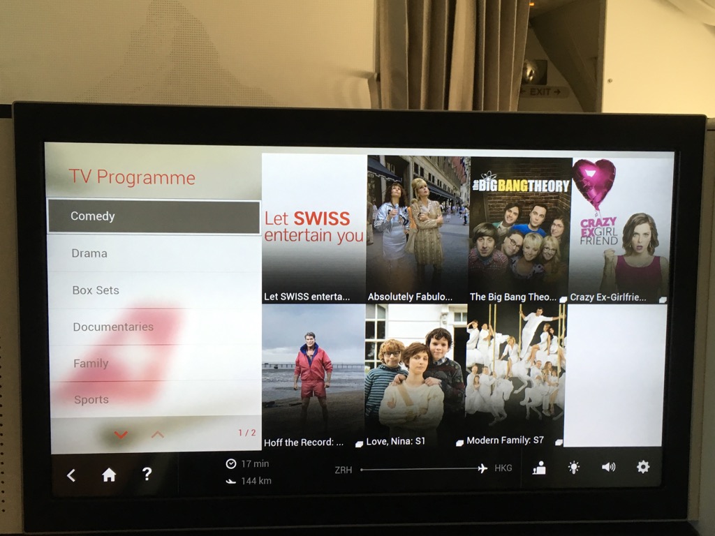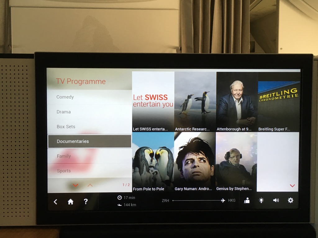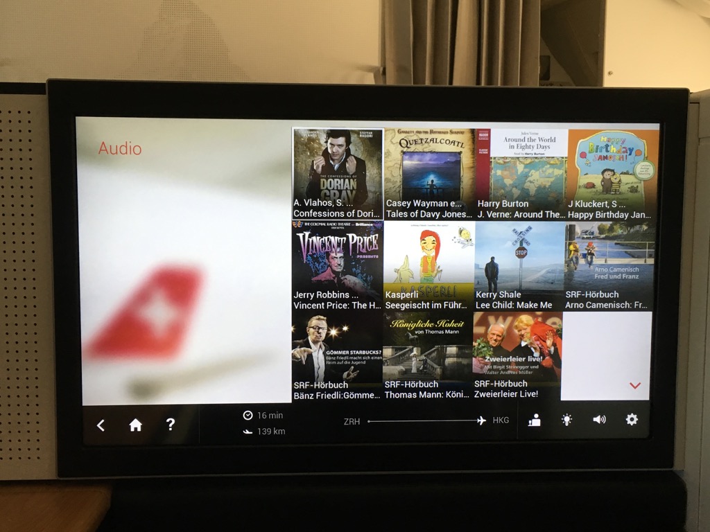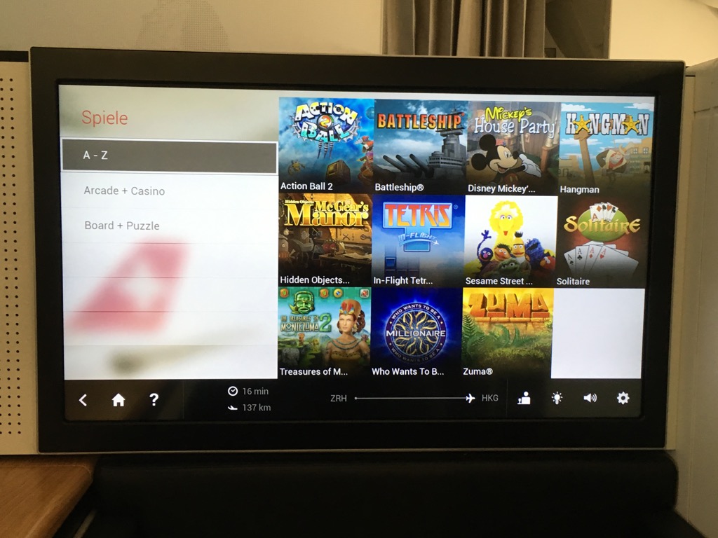 Der Swiss First Class Sitz verfügt über einen riesigen IFE Bildschirm. Dieser lässt sich über eine Touchscreenfernbedienung bedienen. Die Auswahl an Filmen, Serien, Musik und Spielen ist wirklich umfangreich. Allerdings habe ich das IFE auf diesem Nachtflug nicht genutzt. Positiv ist mir allerdings aufgefallen, dass man auf der Fernbedienung die Karte einblenden kann, während man einen Film schaut.