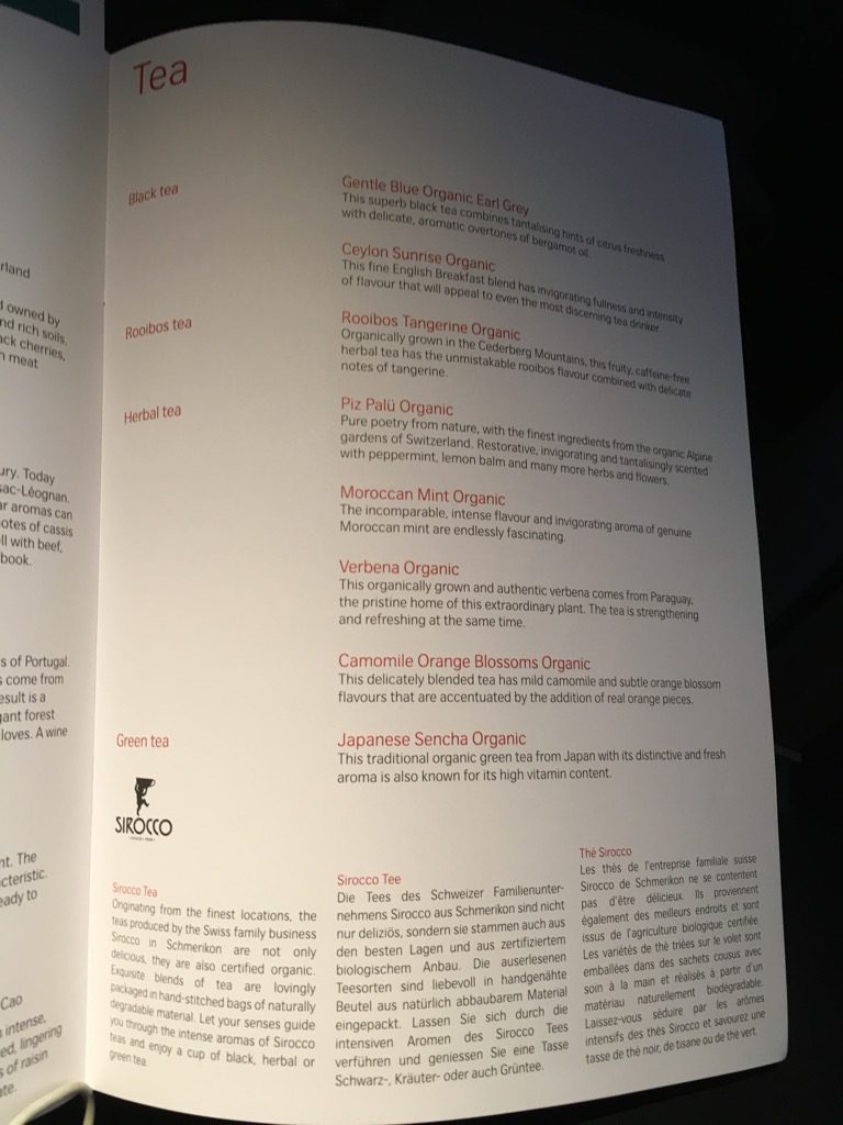 Der Start in Zürich erfolgte nach 23 Uhr und kaum waren die Anschnallzeichen ausgeschaltet begann die Crew mit dem Service. Die Menükarte wurde uns bereits am Boden überreicht und die Essenswünsche abgefragt.