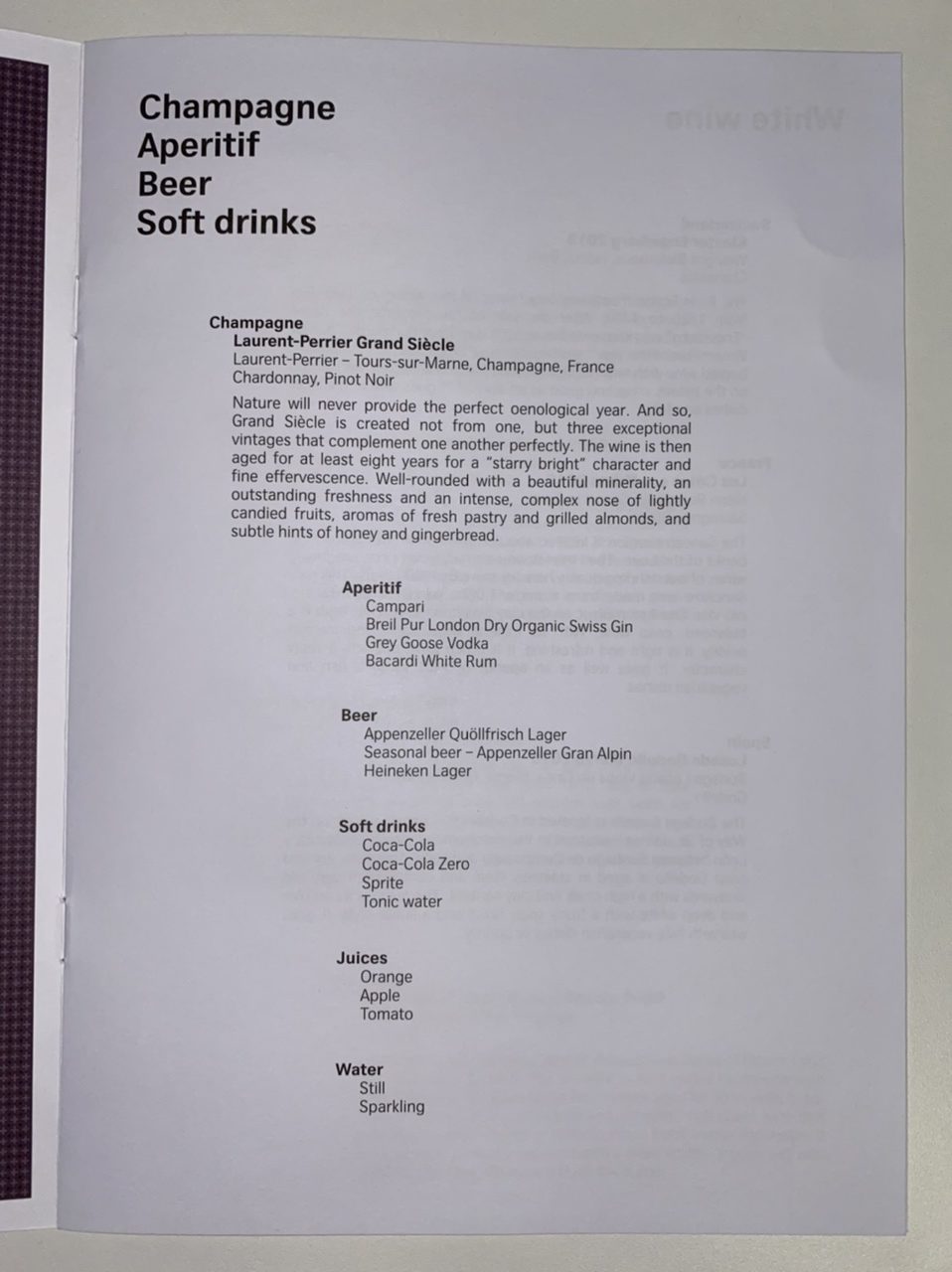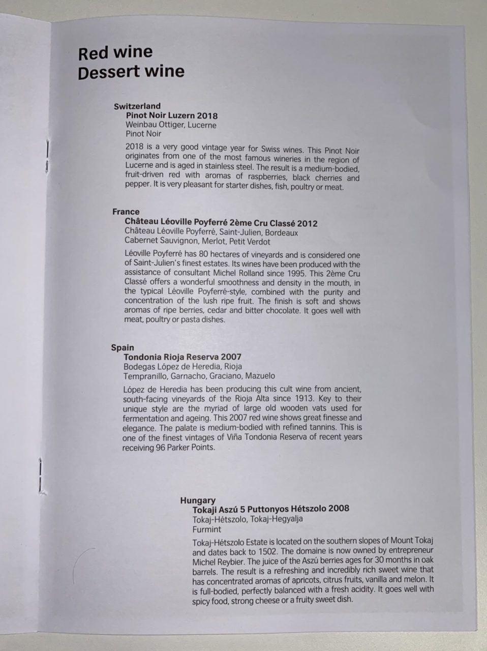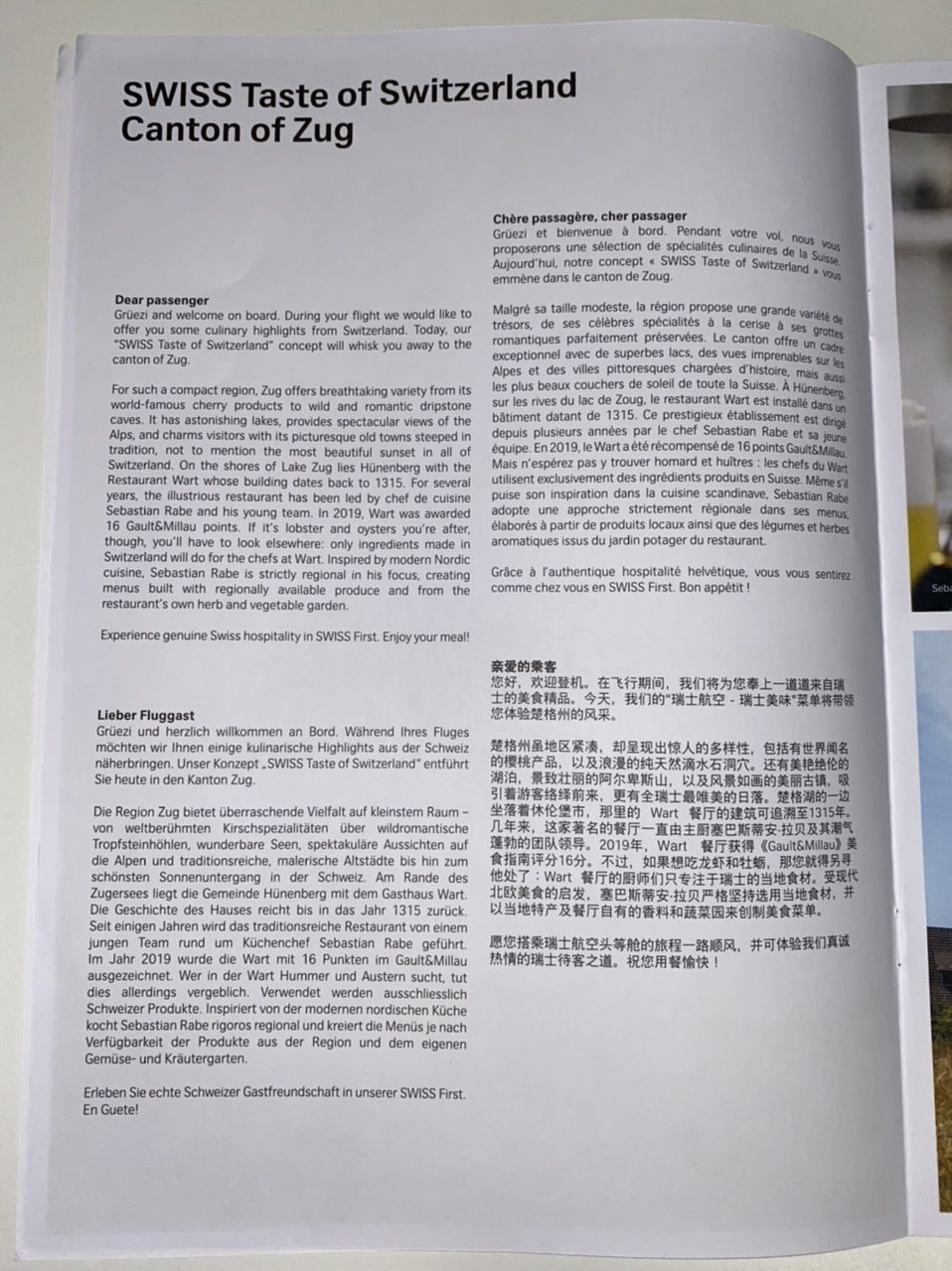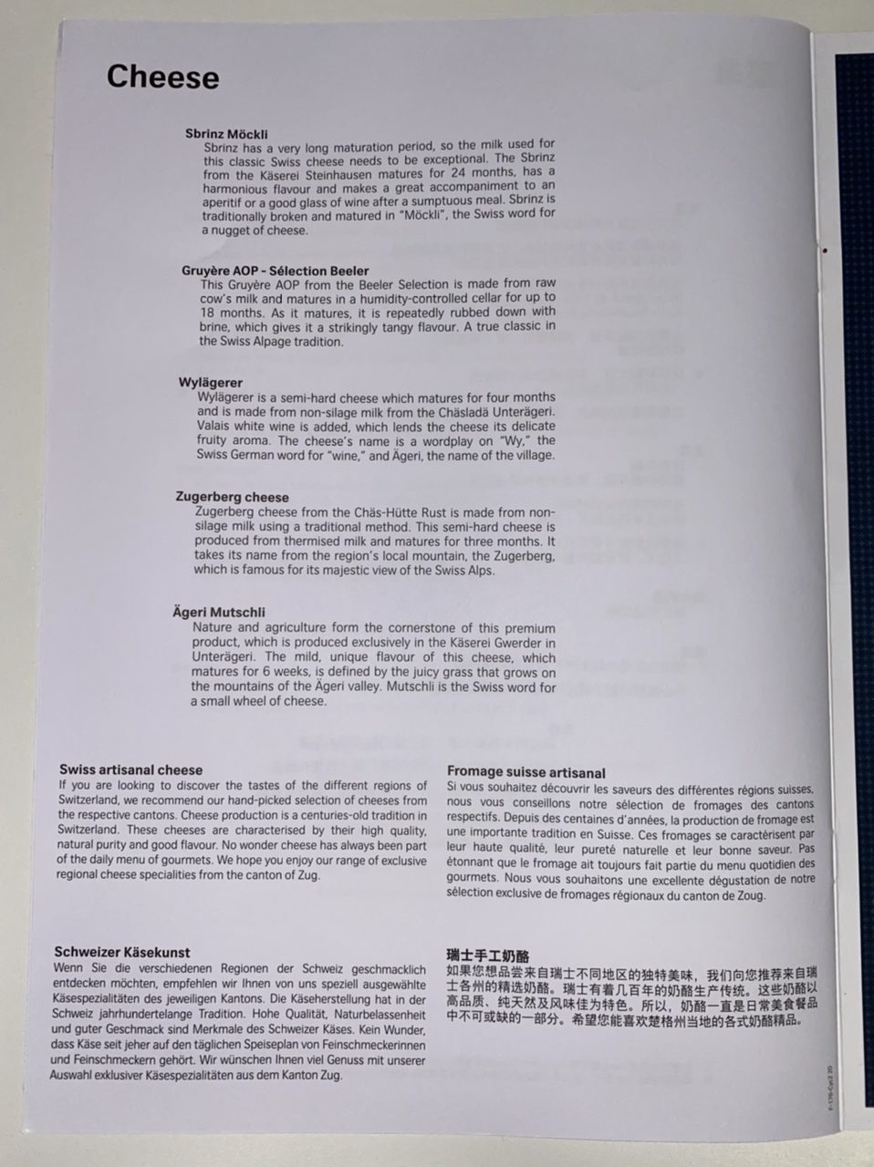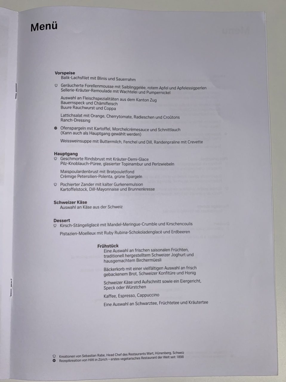 Das Menü, welches aus Produkten aus dem schweizerischen Kanton Zug zubereitet wird, wurde mit Swiss Klassikern und einem Tagesgericht ergänzt, welches bei der Menü Wahl noch mal ausführlich vorgeschlagen wurde. So selbstverständlich wie der Kaviar in der Lufthansa First Class ist, ist es ebenso der Balik-Lachs in der Swiss First Class. Normalerweise bin ich kein Fisch-Freund, jedoch hat mich der Lachs geschmacklich überwältigt.