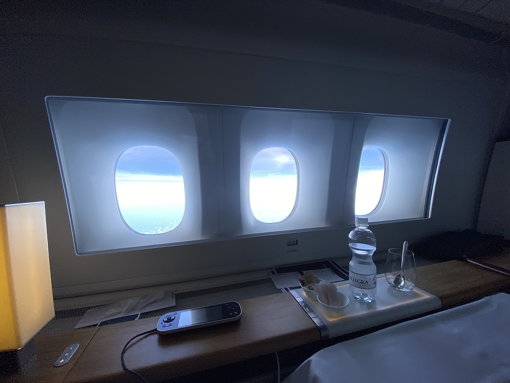 Kurze Zeit später wurde mir mein riesiges Bett zurechtgemacht, während ich mich umzog und wusch. Und damit ging sehr schnell, wie schon häufig an diesem Tag, der erste Teil des Fluges vorbei.