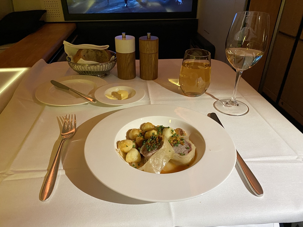 Immer präsent, jedoch nie aufdringlich waren beide Flugbegleiter, welche versuchten zügig durch das Menü zu kommen, um uns Gästen ein Maximum an Schlaf zu ermöglichen. So folgte auf den Balik-Lachs eine Weißweinsuppe mit Buttermilch und als Hauptgang das Tagesgericht, eine Art Roulade.