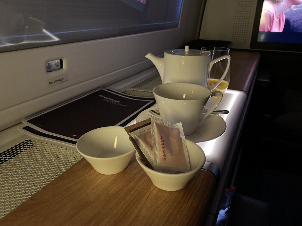 Nach der erholsamsten Nacht an Bord eines Flugzeuges wurde mir noch in der Galley ein „Wachmacher-Saft“ angeboten und gefragt, ob ich gleich oder später Frühstücken möchte. Als ich an meinem Platz wieder ankam war mein Sitz schon wieder aufgeräumt und mein Saft und Tee stand für mich bereit, um gemütlich in den Tag zu starten.