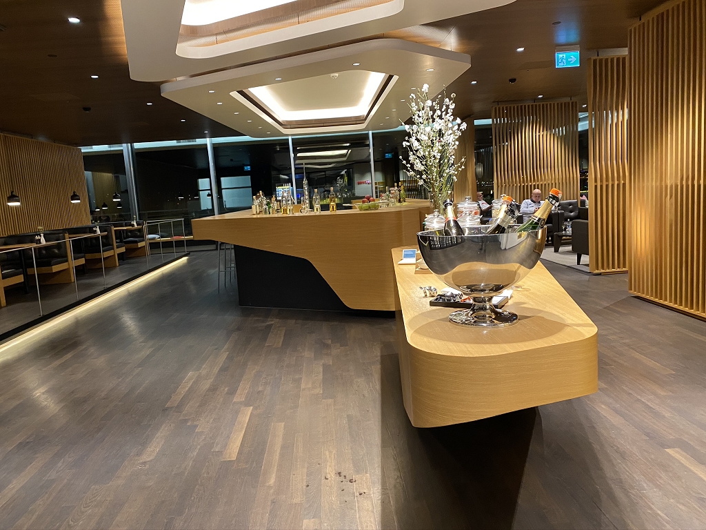 Bei der Ankunft wurde ich sehr herzlich begrüßt und auf ein köstliches Glas Champagner an der Bar eingeladen. Während ich jenes Glas genoss, wurden alle Formalitäten von der Lounge-Mitarbeiterin erledigt und ein Transfer in die First Class Lounge im Terminal E vorgemerkt. Die verbleibenden fünf Minuten bis zum Transfer vergingen mit einem weiteren Champagner und extrem leckerem Popcorn viel zu schnell. Falls Euch die Swiss First Class Lounge im Terminal A interessiert, kann ich Euch die Review von Nicole empfehlen.