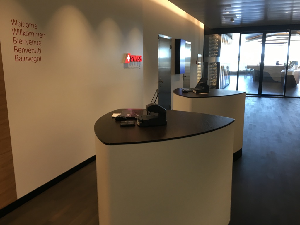 Sobald man aus dem Fahrstuhl, beziehungsweise über die Treppe den Vorraum der Swiss First Class Lounge E betritt wird klar, dass man hier einen weit aus persönlicheres und privateres Konzept verfolgt als in allen anderen Swiss Lounges. Die Gäste werden an mehreren kleinen Stehtischen von Swiss Mitarbeitern begrüßt, in die Lounge eingecheckt und anschließend auch in die Lounge begleitet. Sollte noch etwas rund um den Flug geändert werden, wie Sitzplatzreservierungen, kümmert man sich darum während der Gast in der Lounge sitzt.