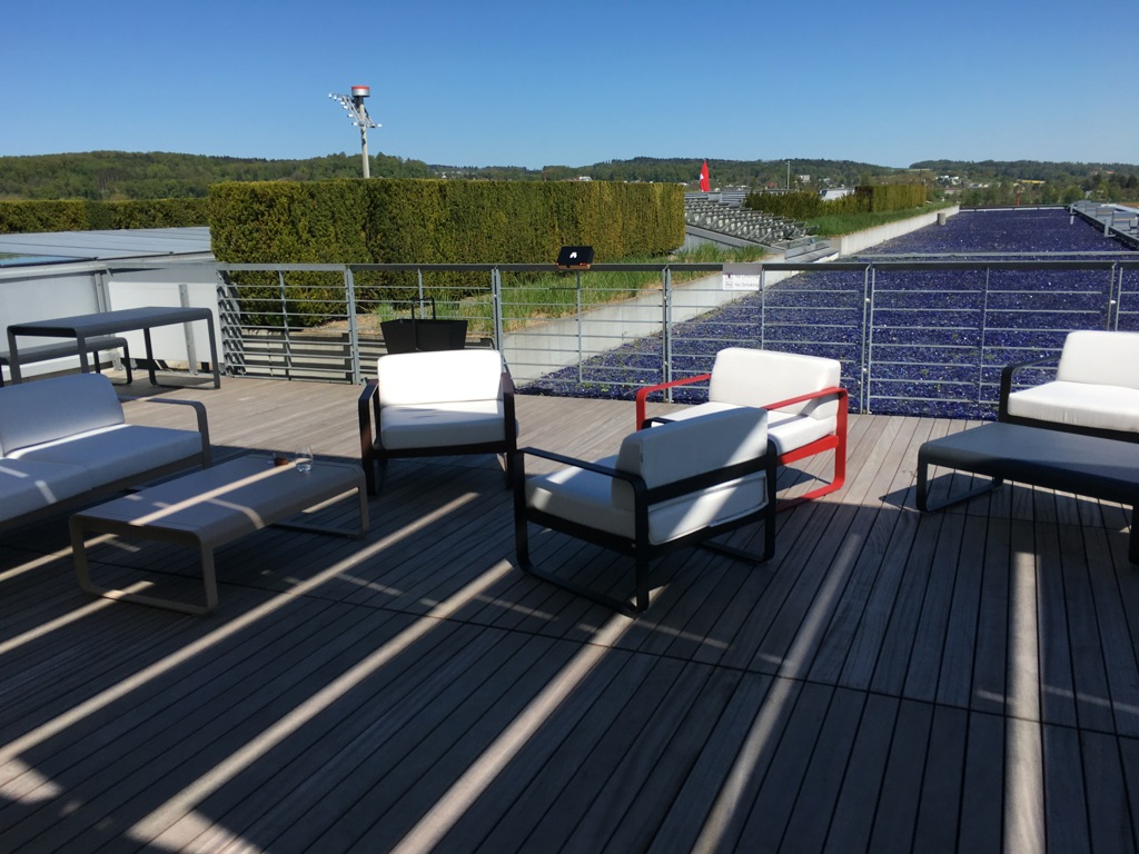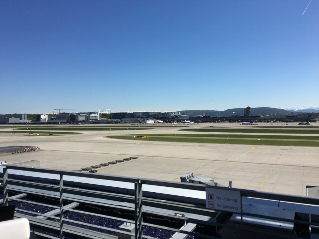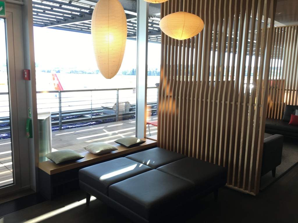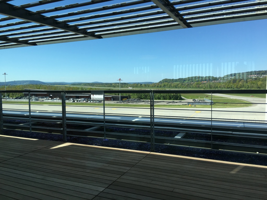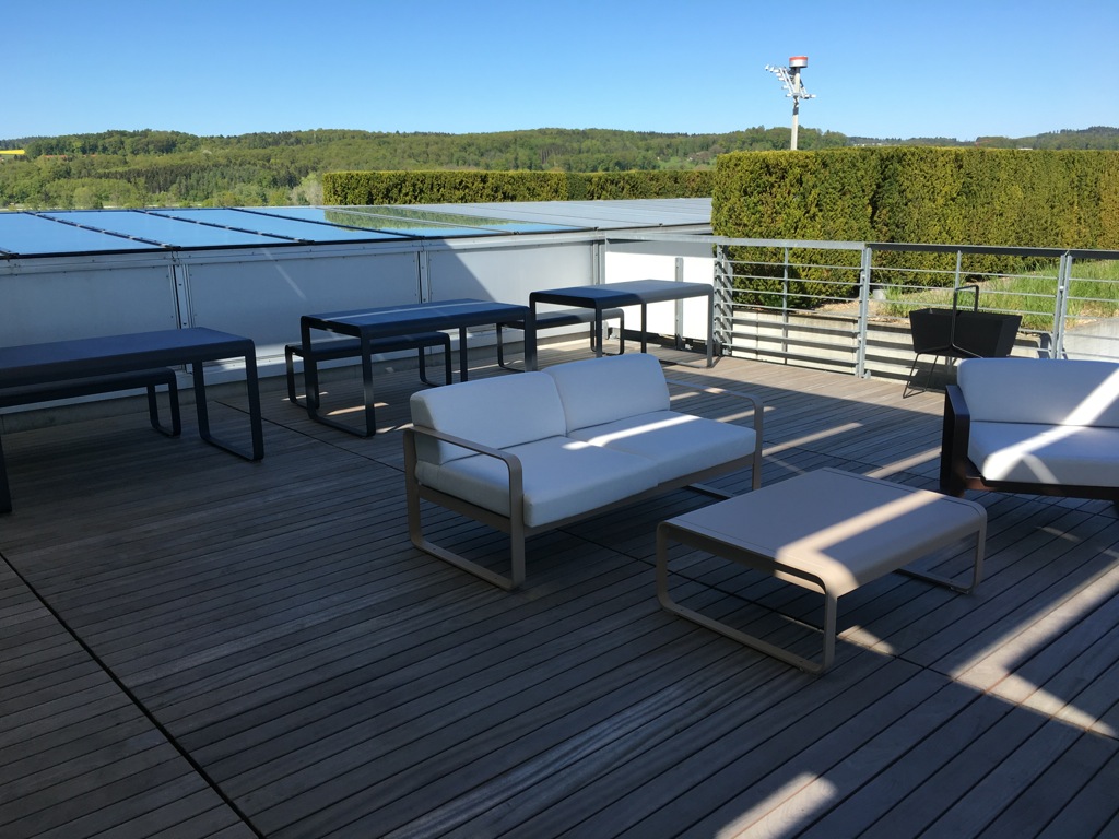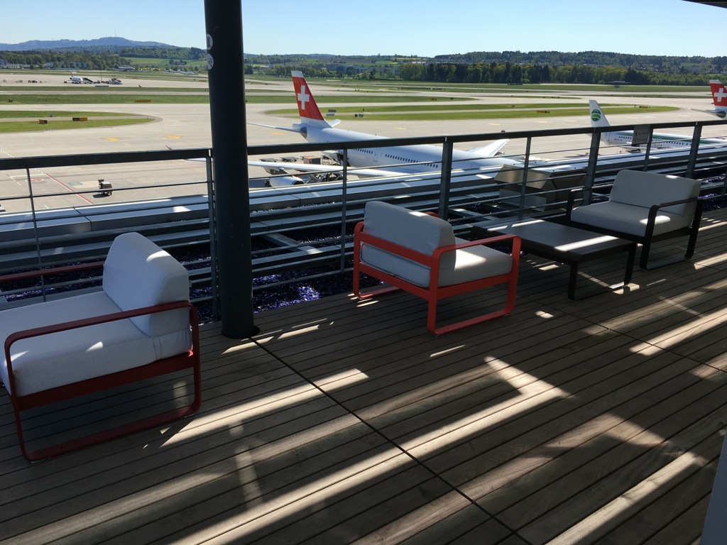 Besonders bei guten Wetter lässt es sich auch auf der Dachterrasse der Swiss First Class Lounge E sehr gut auf den Abflug warten. Die Terrasse ist dabei übrigens auch der Raucherbereich der Lounge.