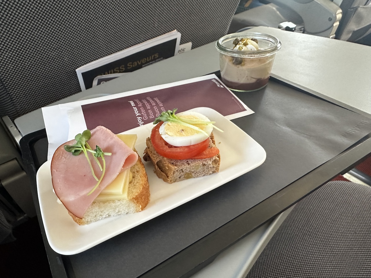 Die reine Flugzeit wurde mit nur 30 Minuten angegeben, wenn man Steig- und Sinkflug abzieht, bleibt nicht mehr viel Zeit zum Essen und Tinken. Die Flugbegleiterinnen haben sich dennoch bemüht und einen aufmerksamen Service durchgeführt. Als Snack wurden Schnittchen gereicht, beim Abräumen der kleinen Platte hat man sogar nach einem weiteren Getränkewunsch gefragt.