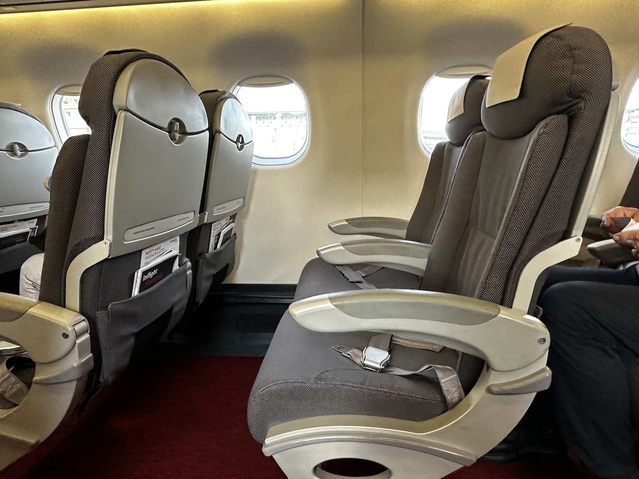 In vielen Embraer Flugzeugen sind noch etwas wuchtigere Sitze mit großen Tischen verbaut, die Campingstuhl-Generation mit den dünneren Sitzen ist inzwischen in den neueren Embraer-Typen zu sehen.