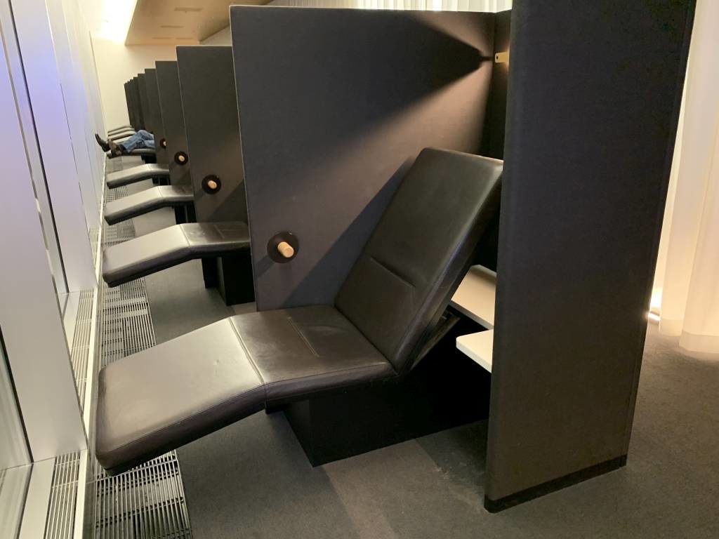 Zunächst kommt Ihr dabei in einem schmalen Gang an diversen Zeitungs- und Zeitschriften-Regalen vorbei. Irgendwann gehen nach rechts die Toiletten ab. Noch etwas weiter befindet sich dann das Getränke- und Essens-Büffet inkl. Livecooking-Station und Esstischen. Den Essbereich trennt ein abgeschirmter Bereich mit Arbeitsplätzen von den übrigen Sitzgelegenheiten der Lounge ab. Ganz am Ende der Lounge findet Ihr noch eine Ruhezone mit einigen Liegen, die den Blick in Richtung Rollfeld werfen lassen.