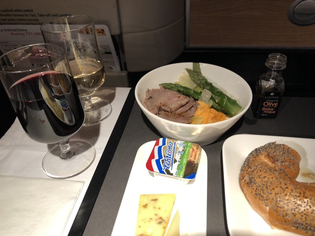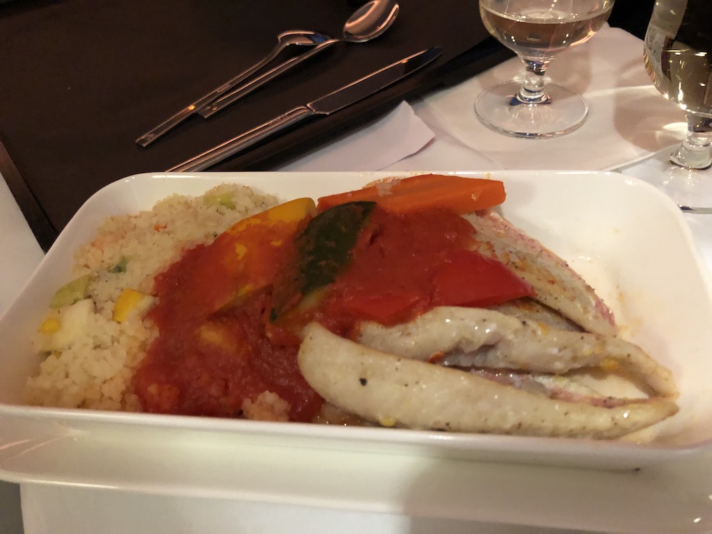 Die nächste Runde Getränke wurde serviert und die Menüwünsche wurden abgefragt. Die kleine Vorspeise wurde zusammen auf einem Tablett mit dem präferierten Hauptgang gereicht, dazu gab es Brötchen. Weitere Getränkewünsche wurden mit einem Dessert serviert, alles in allem ausreichend. Ich fand das Essen insgesamt sehr lecker, besonders der Mandelkuchen hatte es mir angetan.