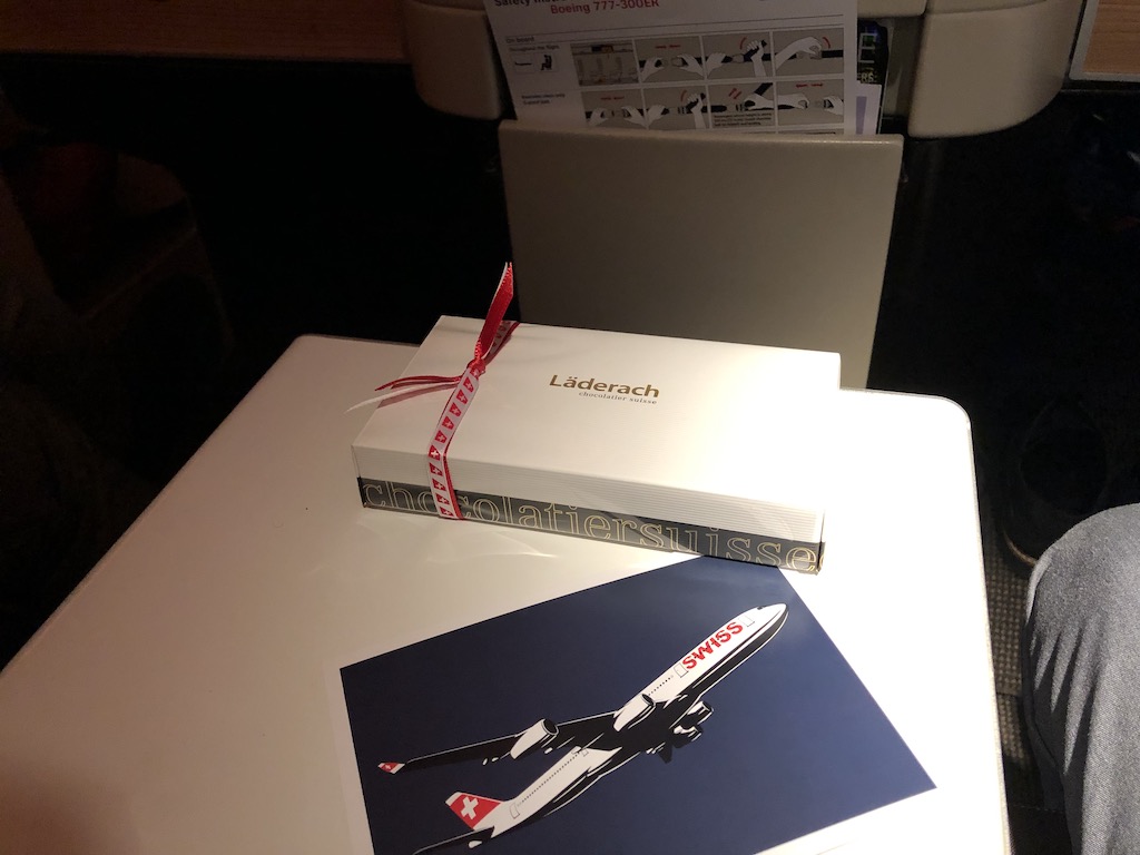 Nach dem Bordverkauf kam die Purserette noch mit Pralinen durch die Kabine und draussen wurde es dunkel. Ideal für einen der vielen Filme oder etwas Arbeit. Swiss bietet Internet mit Volumentarifen an, die Verbindungsqualität war gut.
