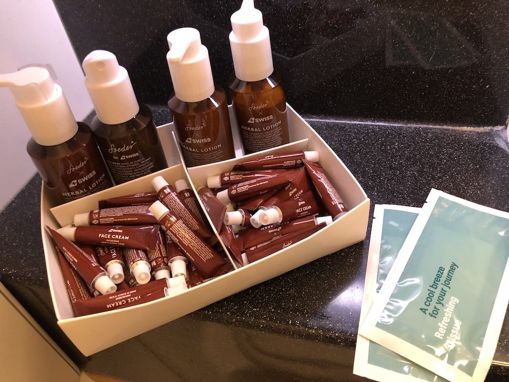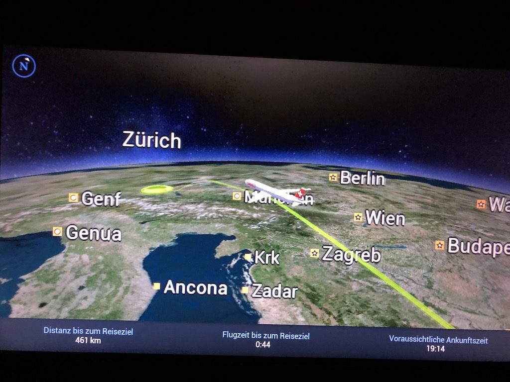 Alles was man von der Swiss-Langstrecke kennt, darf man auch auf dem kürzeren Flug erwarten. Das Unterhaltungsprogramm steht zur vollen Verfügung, bei den Kopfhörern gibt es allerdings noch Verbesserungsbedarf, insbesondere beim Tragekomfort und der Geräuschunterdrückung. Ein Kleiderbügel und das Amenity-Kit waren bereits am Sitz, in den Waschräumen stehen erfrischende Sprays und Cremes bereit.