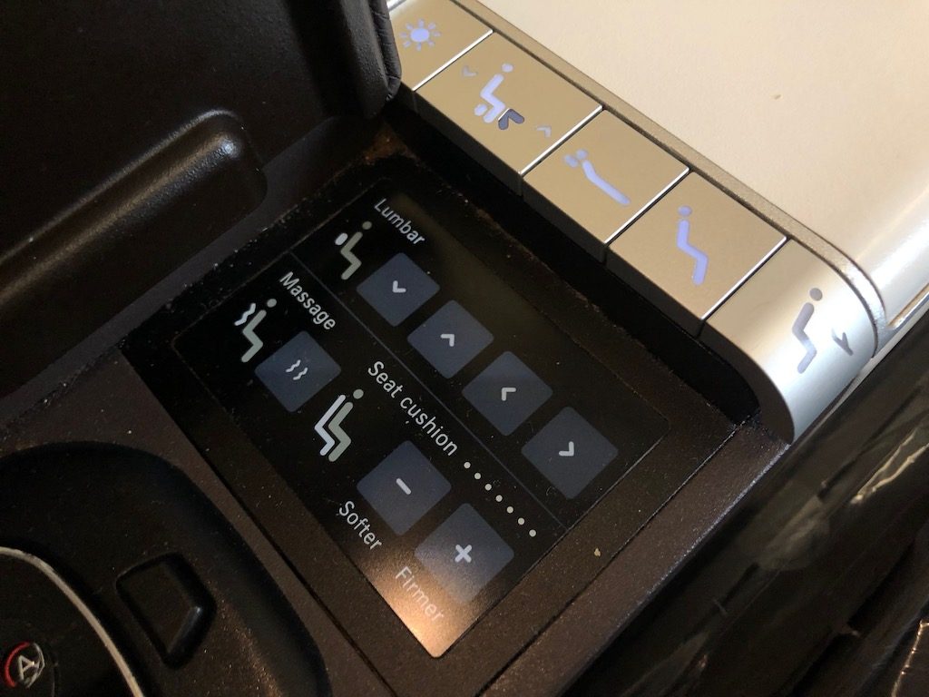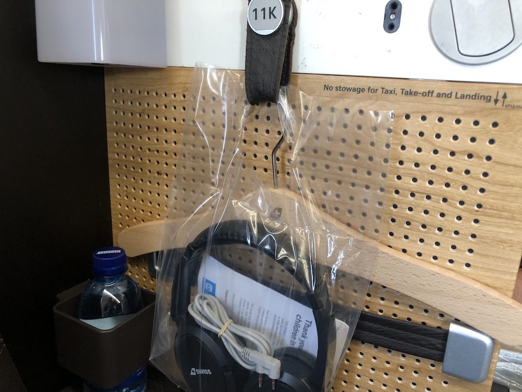 Mein Sitzplatz war heute 11K, einer der beiden fensterlosen in der Business-Kabine. Bei der 2–2-1 Anordnung der Swiss kam der als „Thron“ bezeichnete Einzelplatz für uns nicht in Frage, ich wollte aber nicht in dem Mittelblock sitzen. Daher war ich mit der Wahl doch ganz zufrieden. Da die meisten Gäste in der Business Class Einzelreisende sind, kommen die einzelnen Sitze sehr gut an. Dort sind neben der Privatsphäre auch mehr Ablagemöglichkeiten vorhanden als beim Doppelsitz.