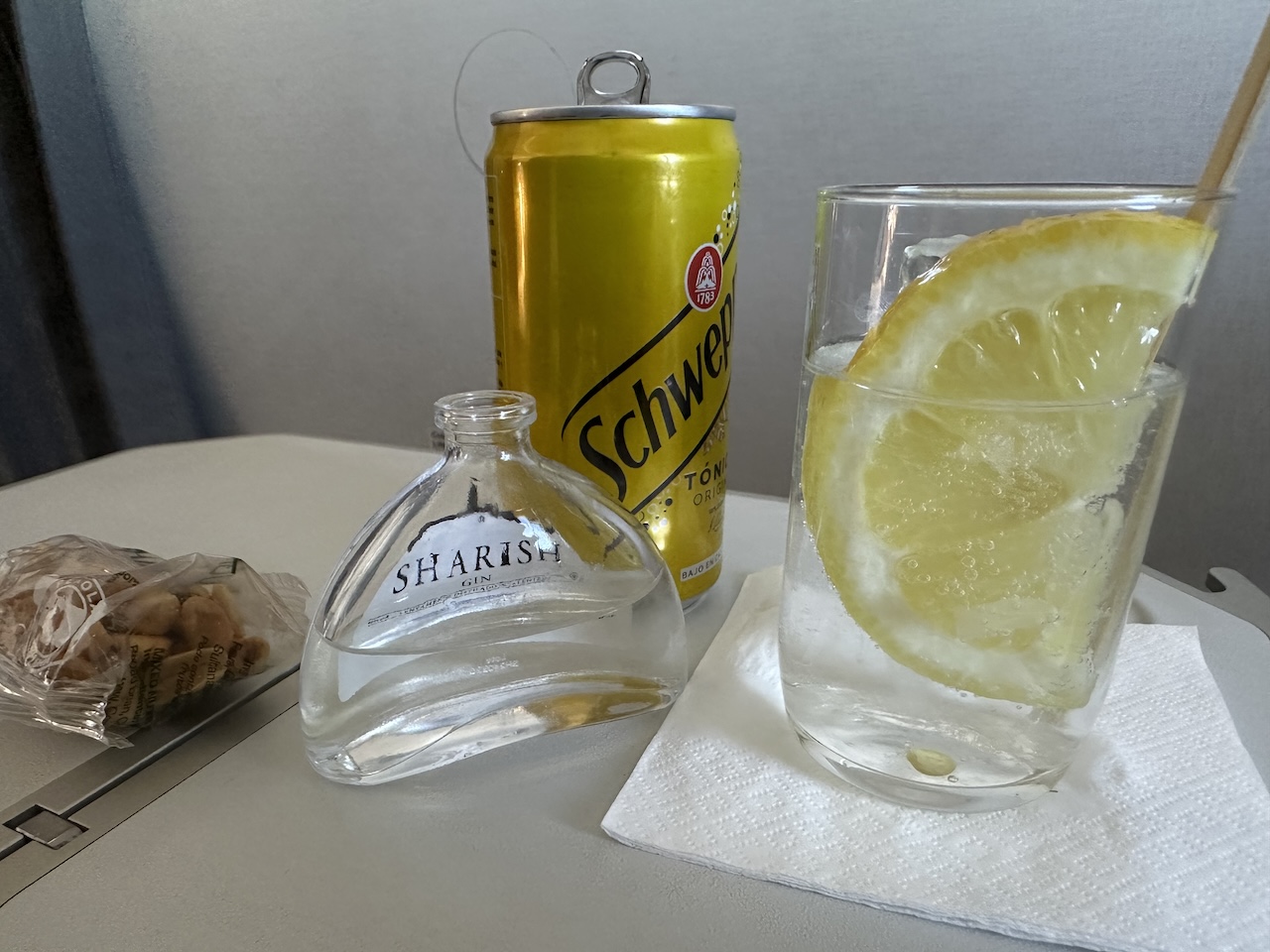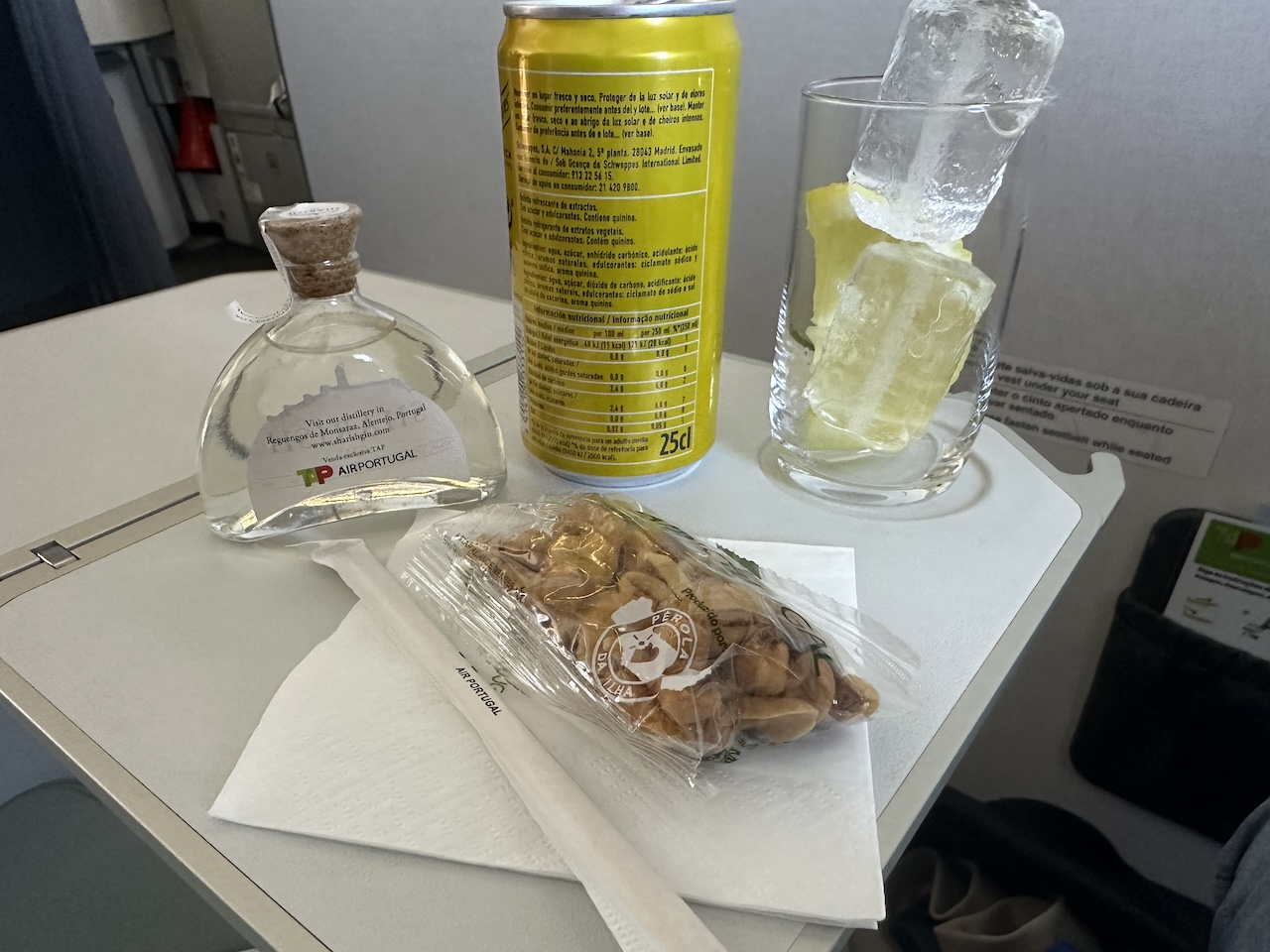 Ich bestellte einen Gin Tonic (der Gin wird übrigens für TAP kreiert), dazu gab es Nüsse.