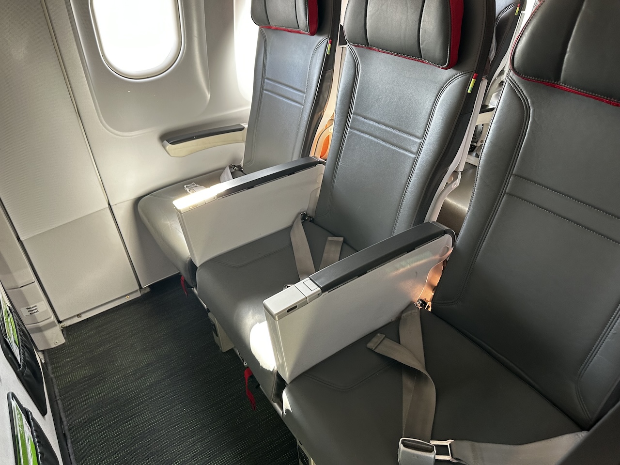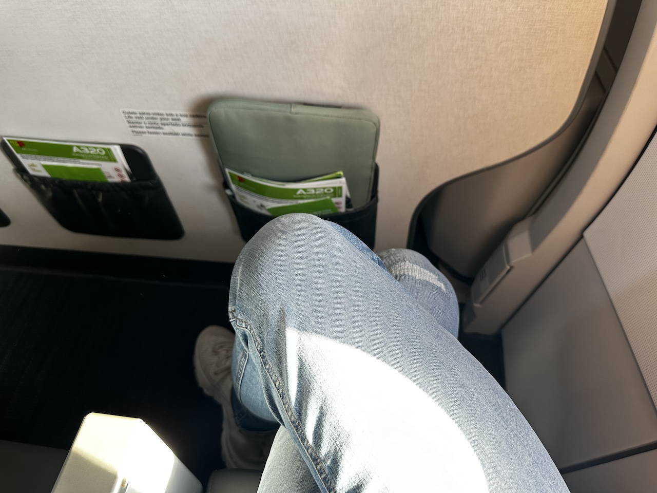 Mein Sitz war heute in der ersten Reihe am Fenster (1F). Hier müssen alle Handgepäckstücke zu Start und Landung verstaut werden. In dem rund 18 Jahre alten Flugzeug waren die aktuellen Sitze der Europa-Kabine mit Stromanschluss installiert.
