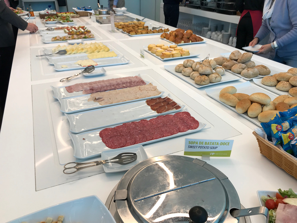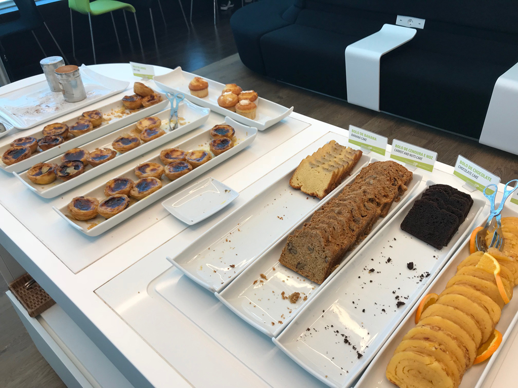 Im hinteren Bereich der Lounge befindet sich ein großes Buffet, an dem diverse kalte und warme Speisen angeboten werden. Während meines Aufenthaltes am Vormittag wurde unter anderem noch ein reichhaltiges Frühstücksbuffet gereicht. Auch eine gute Auswahl an portugiesischen Desserts gab es.
