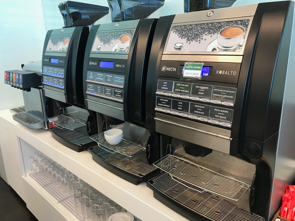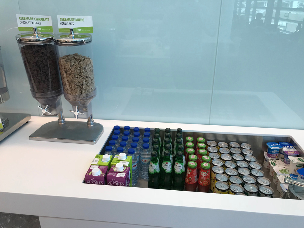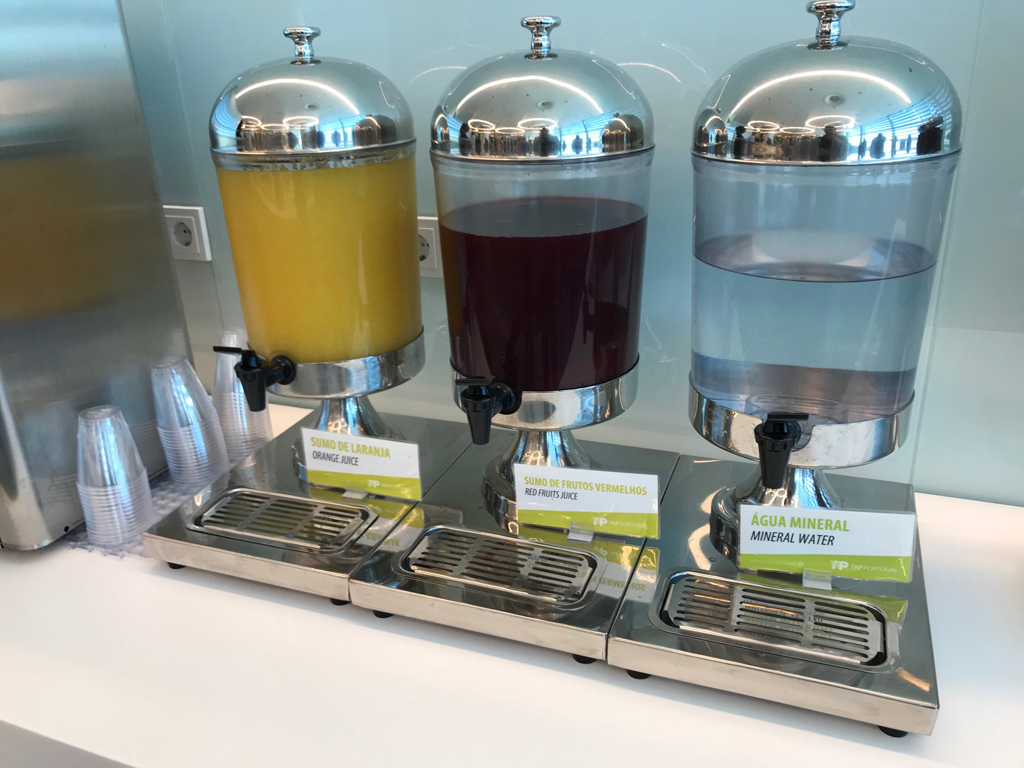 Auch die Auswahl an Getränken ist in der Lounge sehr üppig. Neben diversen Kaffeespezialitäten und Kaltgetränken sowie Säften, wird auch ein großes Angebot an portugiesischen und internationalen Weinen bereitgestellt. Letzteres ist durch eine vollautomatische „Zapfanlage“ in einem Selbstbedienungskonzept gestaltet.