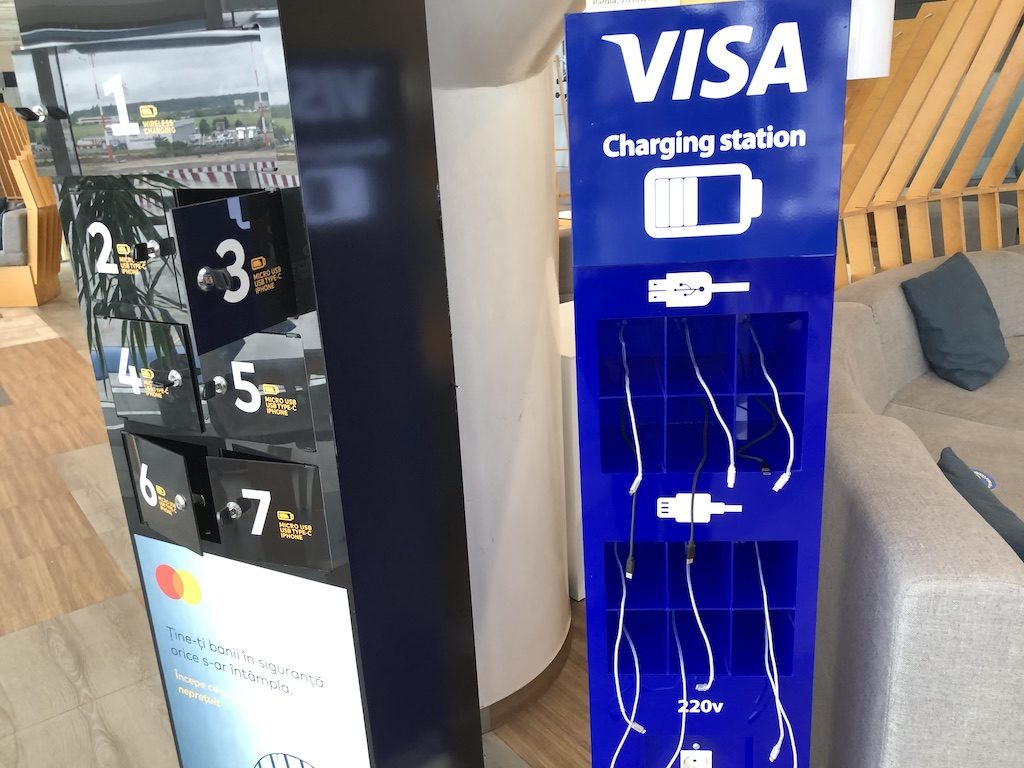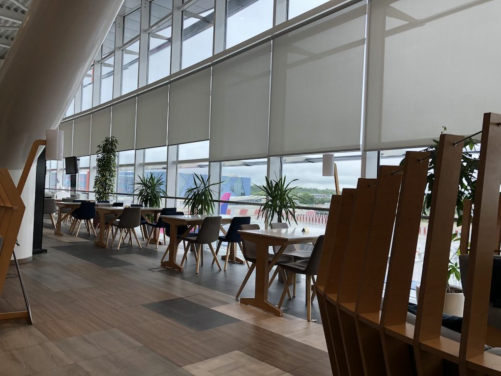 Die Lounge erstreckt sich am Panoramafenster des Terminals und erlaubt von vielen Stellen einen Blick auf das Vorfeld. Der Internetzugang ist kostenfrei und stabil, Steckdosen gab es nur in Buchsen die im Fußboden verbaut sind. Zum Laden von kleineren Geräten gab es Schließfächer mit Ladekabeln.