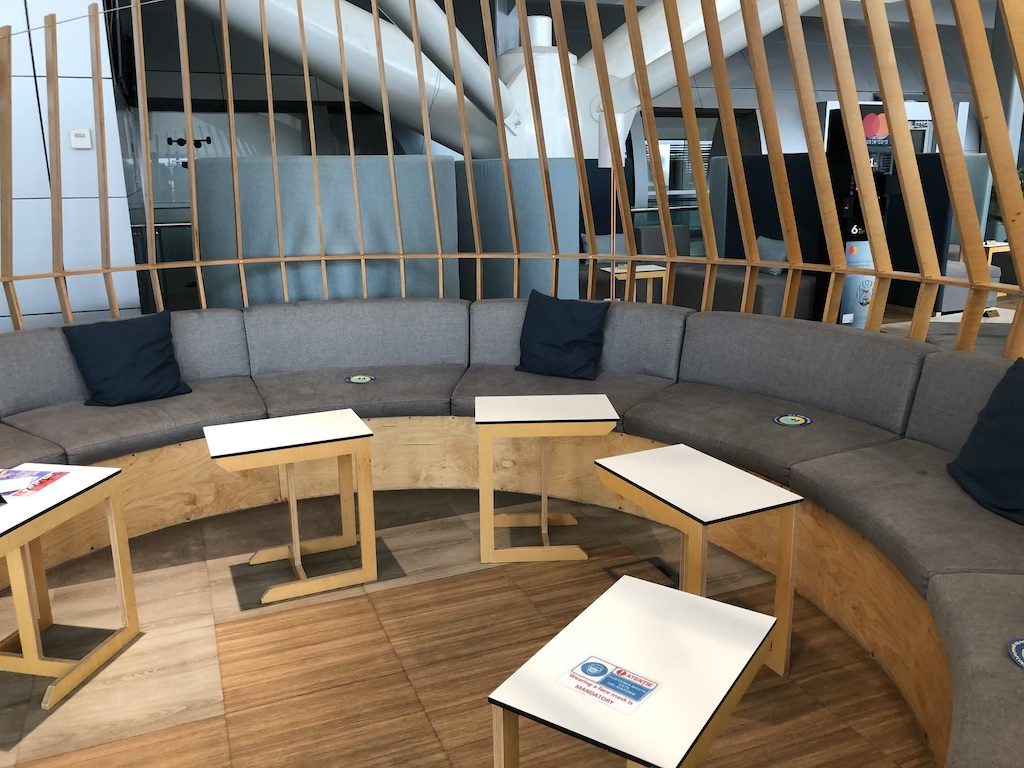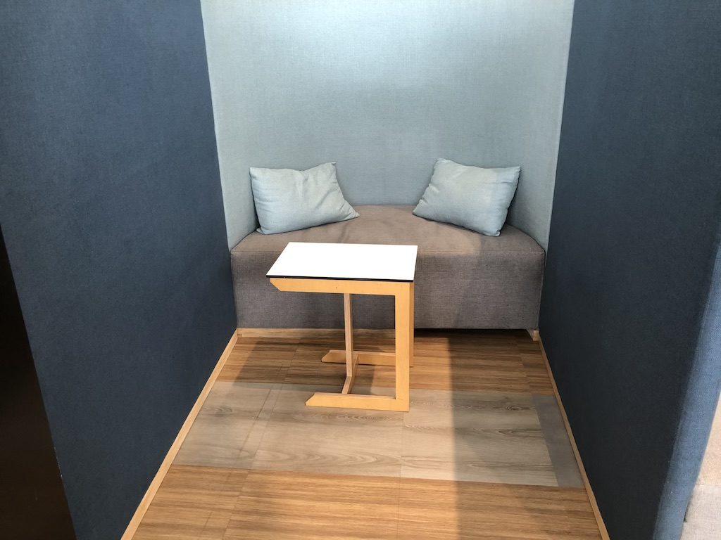 Es gibt mehrere Sofas in verschiedenen Größen, dabei sind die kleineren besser abgeschirmt und bieten etwas Privatsphäre. Die größeren eignen sich für Familien oder Gruppen und Gäste die gerne unter Leuten sind. Außerdem gibt es zahlreiche Tische mit Stühlen die sich sowohl zum Essen als auch zum Arbeiten eignen.