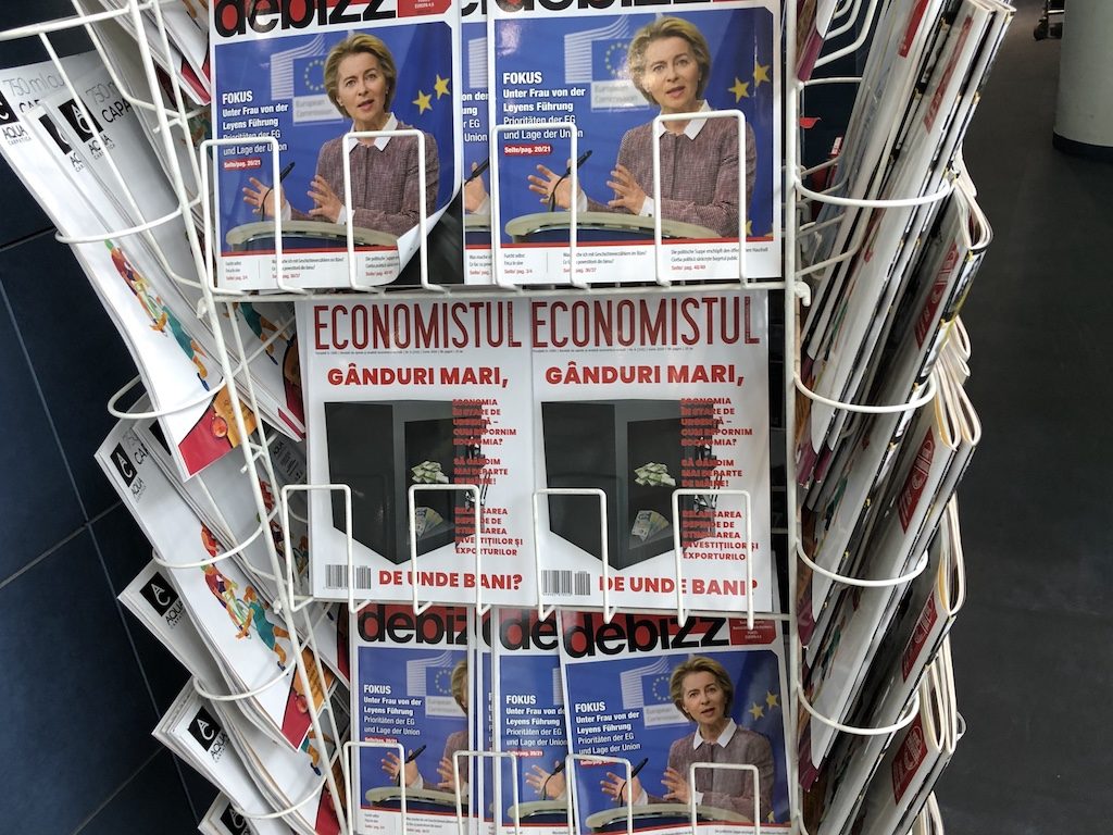 Auf dem Weg zu den Sitzmöglichkeiten ist das Buffet aufgebaut, an einem Zeitungsständer gibt es ein wenig Lesestoff. Das Angebot ist relativ dünn, ich kann aber nicht sagen ob es eine Auswirkung des grassierenden Virus ist. An einem Tisch waren zuvor scheinbar zwei Computer und Drucker installiert, die temporär entfernt wurden.