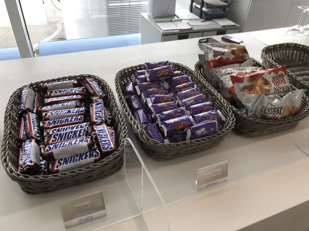 Ich vermute die Süßigkeiten wie Schokoriegel und Kekse werden ganztägig angeboten, salzige Knabbereien wurden nicht serviert. Als Geschirr kamen ausnahmslos Teller, Becher und Besteck zum einmaligen Gebrauch zum Einsatz.