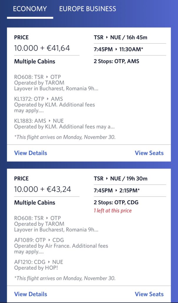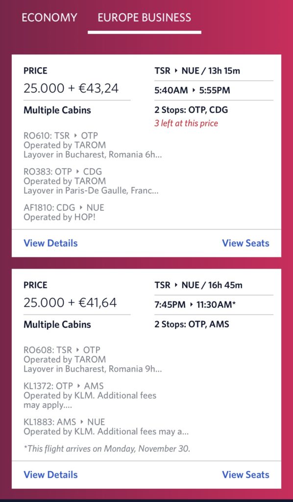 Normalerweise kann man diese Verbindung mit nur einem Zwischenstopp bei Lufthansa buchen, durch die ausgedünnten Flugpläne wurden jetzt zwei Umstiege erforderlich. Der reguläre Tarif liegt bei mehreren Hundert Euro, daher war die Option mit Meilen sehr interessant. Bei Flying Blue hätte meine Wunschverbindung 27.500 Meilen in Economy Class gekostet, bei Skymiles von Delta waren es nur 25.000 in Business Class. Die Nebenkosten liegen bei gut 40€ und sind im Vergleich sehr fair.