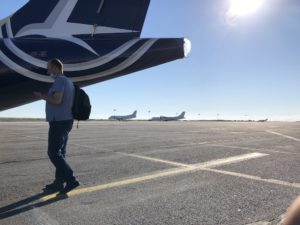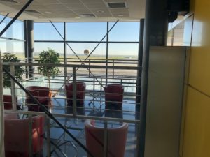 Nur wenige Menschen waren an der Sicherheitskontrolle vor mir, entsprechend schnell war ich am Gate. Die kleine Maschine war ausgebucht, immerhin passen über 70 Personen in das Flugzeug. Der kleine Wartebereich war im Laufe der Zeit gut gefüllt. Ein Schild verwies auf eine Business Lounge im ersten Obergeschoss, leider war diese geschlossen. An diesem Tag war nur ein weiterer Inlandsflug geplant, daher scheint sich diese temporär nicht zu lohnen. Einen kleinen Blick konnte ich dennoch in das Interieur werfen. Die Einrichtung wirkt hell und erlaubt einen Blick aufs Vorfeld.