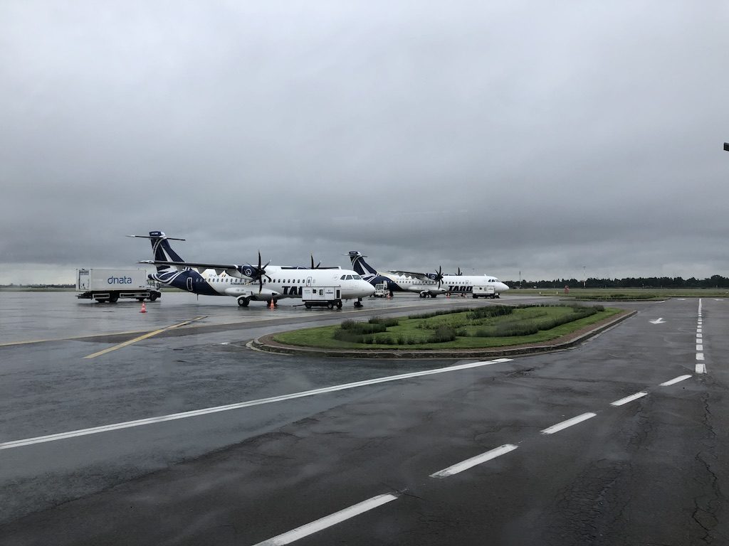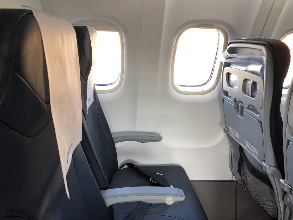 Die Kabine ist in der ATR in einer 2-2 Bestuhlung angeordnet, der Flug heute wurde in einer reinen Economy-Version durchgeführt. Die Privilegien wie erhöhtes Freigepäck oder Loungezugang wären durch die Buchung im Business-Tarif unter normalen Umständen auch auf diesem Flug anwendbar.
