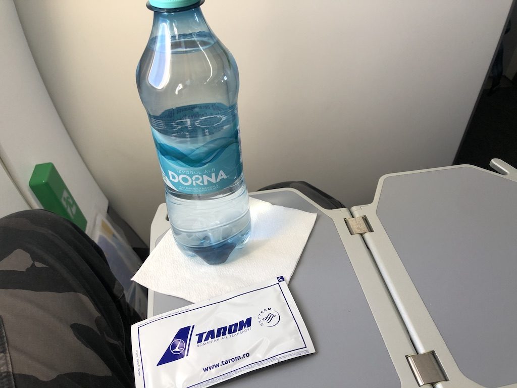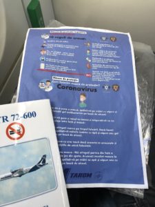 Nach dem Start verteilten die Flugbegleiter Wasser und ein Erfrischungstuch. Es scheint sich zum aktuellen Standart auf kurzen Flügen in Economy Class entwickelt zu haben. Auf Kissen, Decken und Bordmagazin verzichtet der rumänische Carrier zur Zeit, neben der Sicherheitskarte sind Hinweise zum Umgang mit dem Virus in der Sitztasche ausgesteckt.