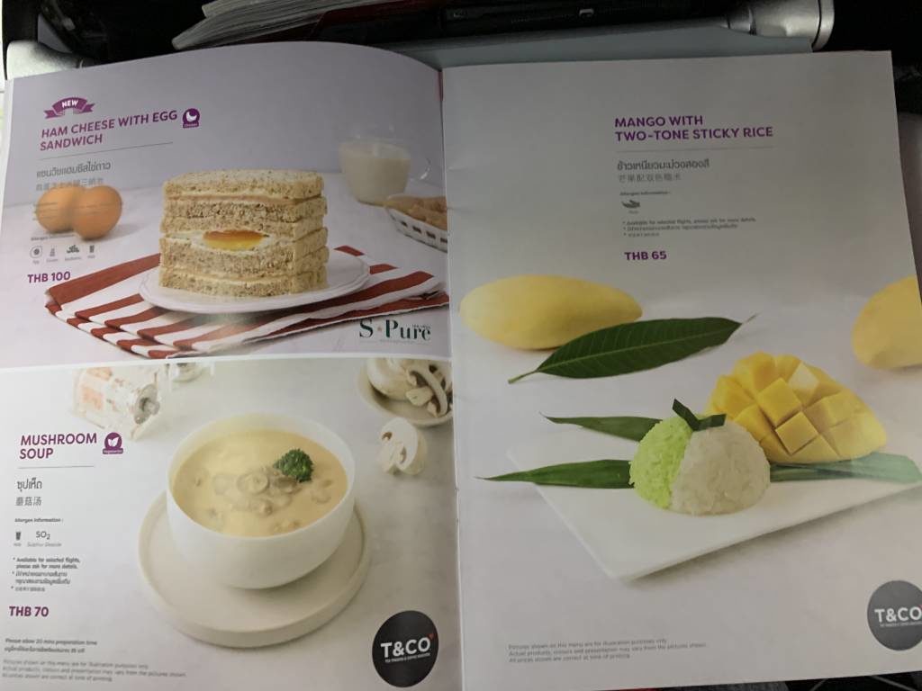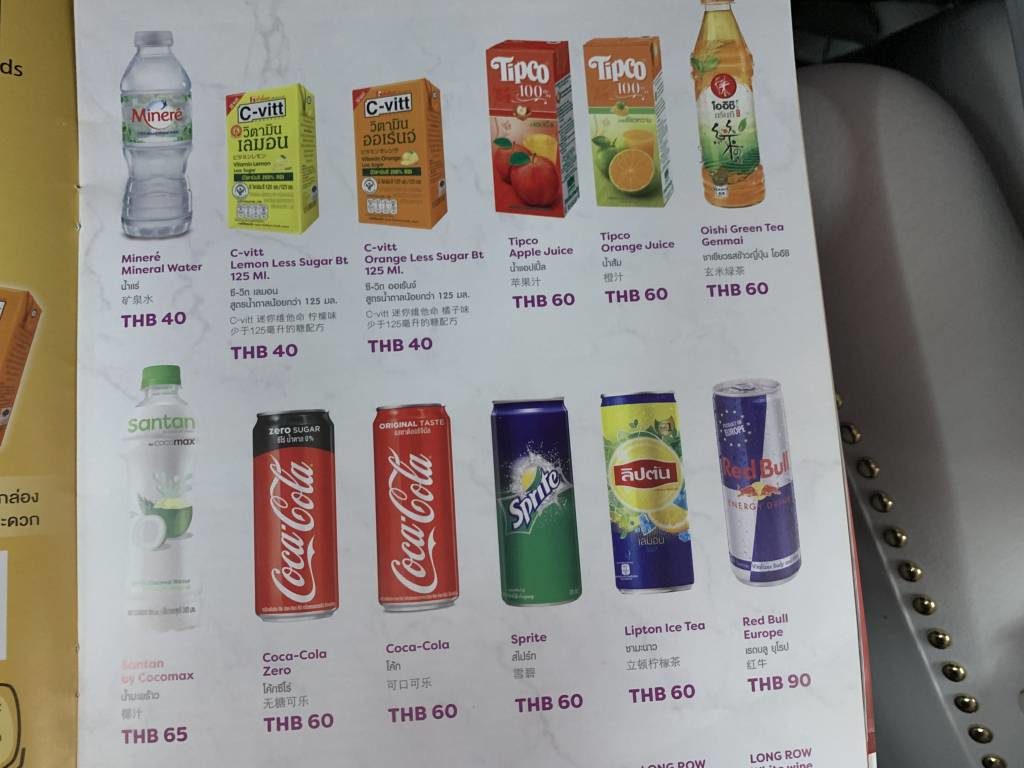Die „buy on board“-Speisekarte ist bei Air Asia sogar sehr umfangreich. Es gibt einige vollwertige Gerichte, Instant-Nudelsuppen, süße und herzhafte Snacks und diverse Getränke. Was es nicht gibt, sind alkoholhaltige Getränke. Preislich ist Thai Air Asia wirklich fair. So kostet ein Hauptgericht unter 5 Euro (150 THB) und ein Softdrink oder eine Instant-Nudelsuppe unter 2 Euro (60 THB).