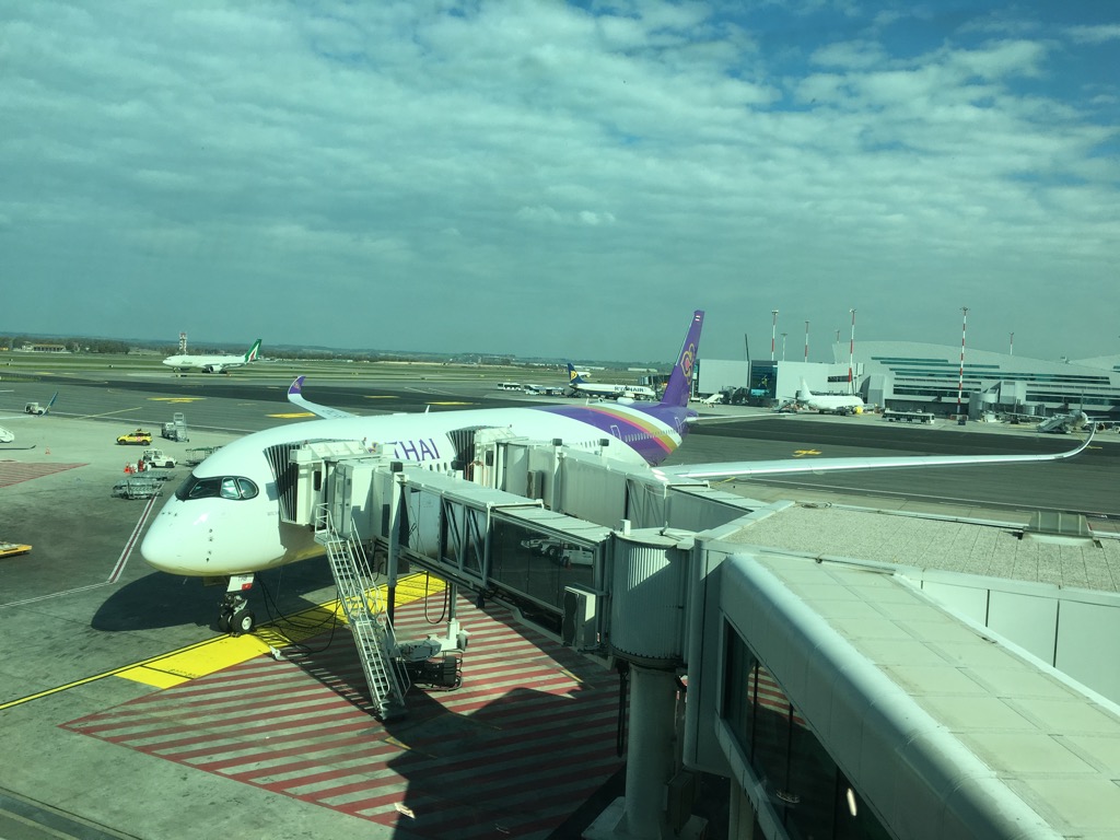 Nach unserem Aufenthalt in der Casa Alitalia Lounge, haben wir uns etwa eine Stunde vor dem Abflug und 15 Minuten vor dem Boarding auf den Weg zum Abfluggate für unseren Thai Airways Business Class Flug im Airbus A350 nach Bangkok gemacht. Ich habe mich auf den Flug im Thai Airways Airbus A350 extrem gefreut, denn glaubt es oder nicht, es war mein erster Flug in einem Airbus A350.