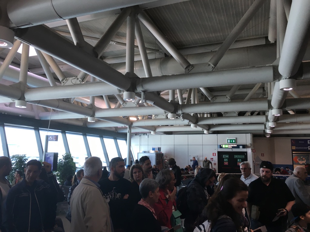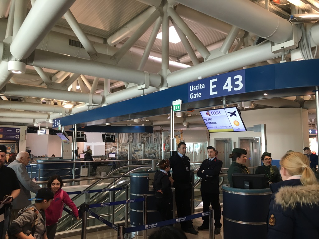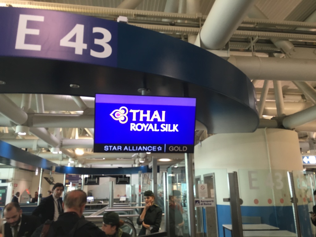 Als wir am Gate angekommen sind, trafen wir bereits auf eine riesige Menschentraube, so dass der Versuch zum Gate Agent zu gelangen nicht so einfach war. Hier fragte ich, ob unsere Passdaten noch einmal eingelesen werden mussten, da wir von Lufthansa in Frankfurt bereits eingecheckt wurden. Von den fünf am Gate stehenden Alitalia Mitarbeitern, welche unseren Flug abgefertigt haben, waren anschließend drei damit beschäftig, unsere Pässe einzulesen. Nach wenigen Minuten wurden uns allerdings Kommentarlos neue Thai Airways Bordkarten überreicht.