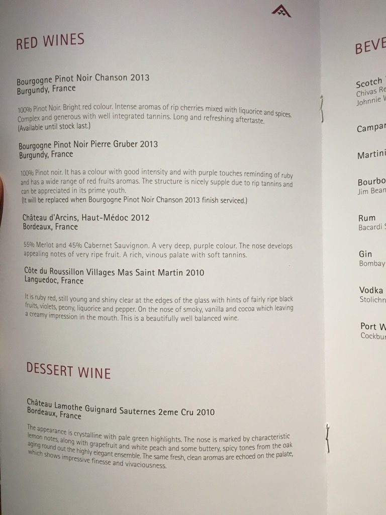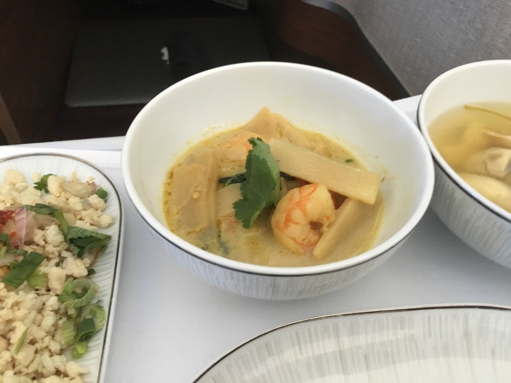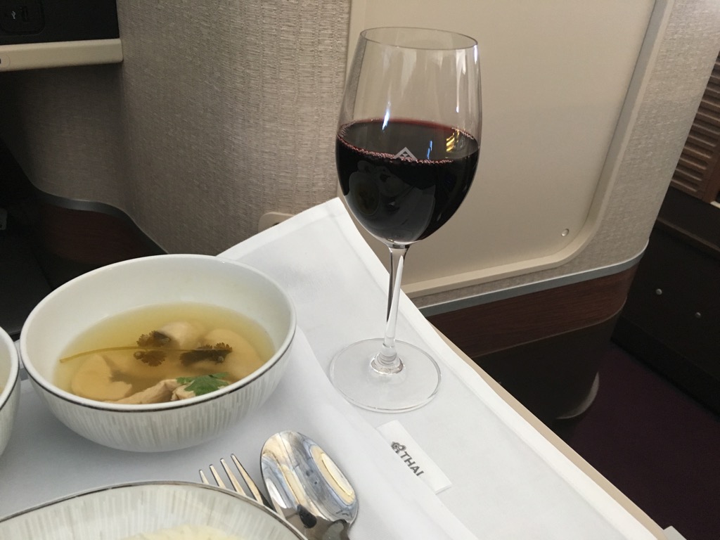 Mein Thai essen war extrem gut und leicht scharf gewürzt, was im Flugzeug immer sehr angenehm ist. Hierzu habe ich ein Glas Rotwein getrunken, auch wenn es nicht unbedingt die passende Wahl war.