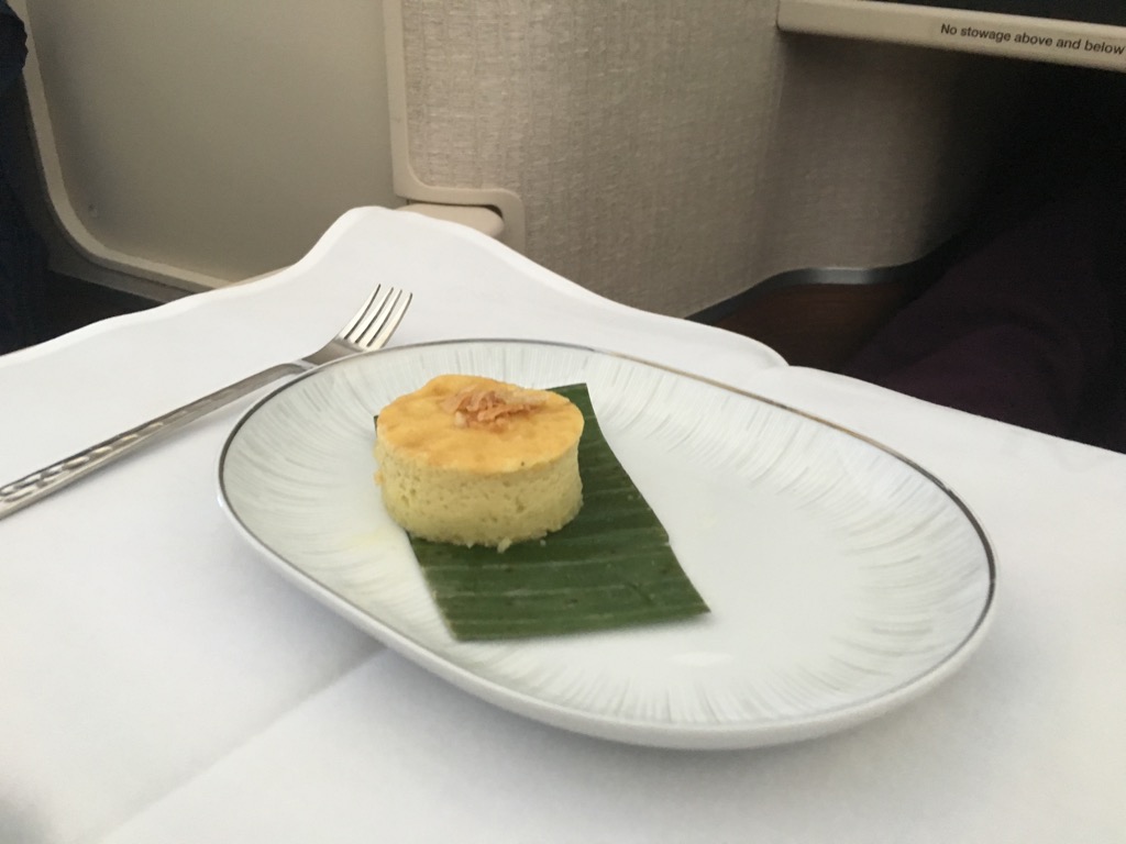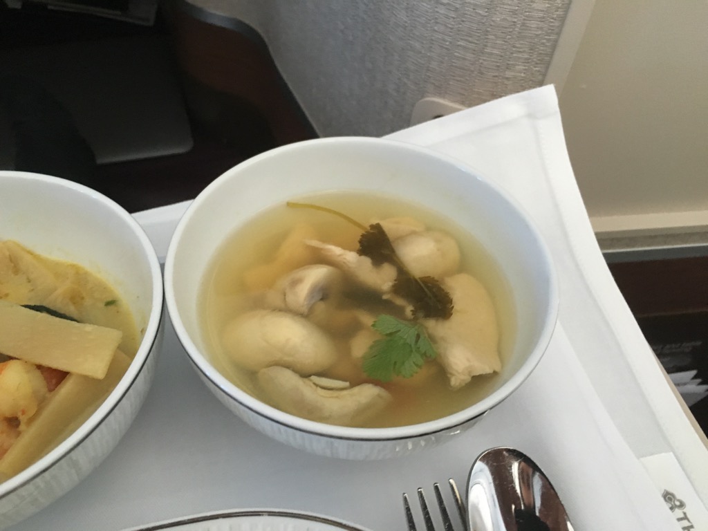 Nachdem ich etwa vier Stunden vor der Landung aufgewacht bin, stand wenige Minuten später eine Flugbegleiterin neben mir und fragte mich, ob ich etwas zu essen wollte. Ich bestellte aus dem all Day dinning Menü die Nudelsuppe, welche auch nur 10 Minuten später serviert wurde.