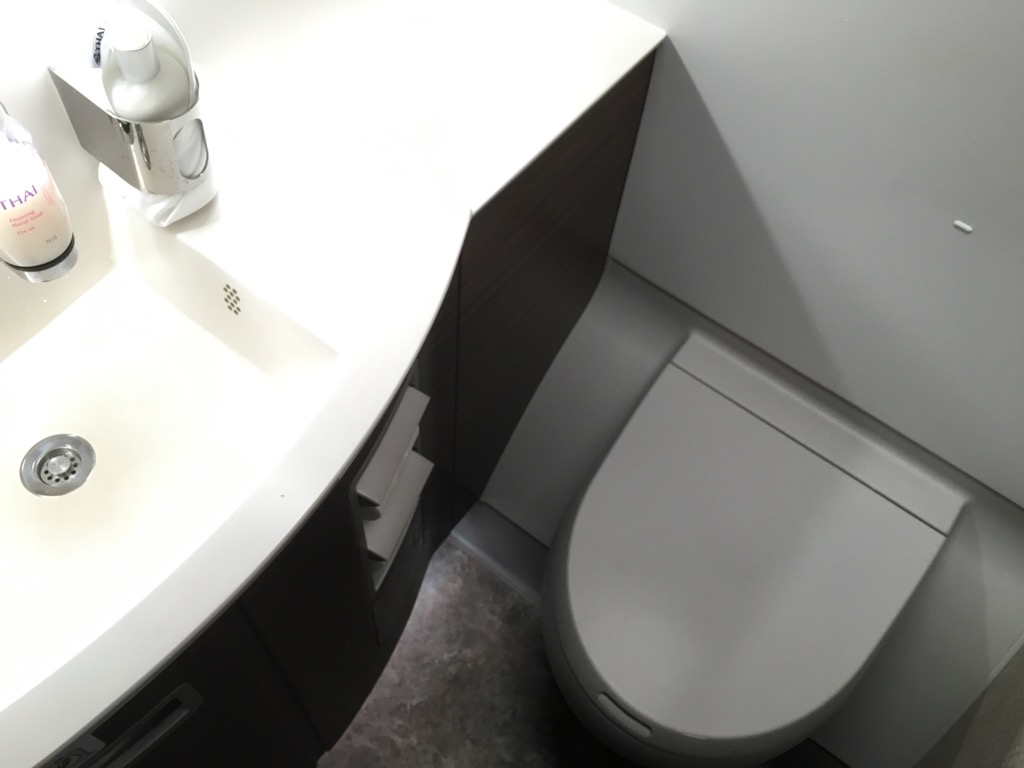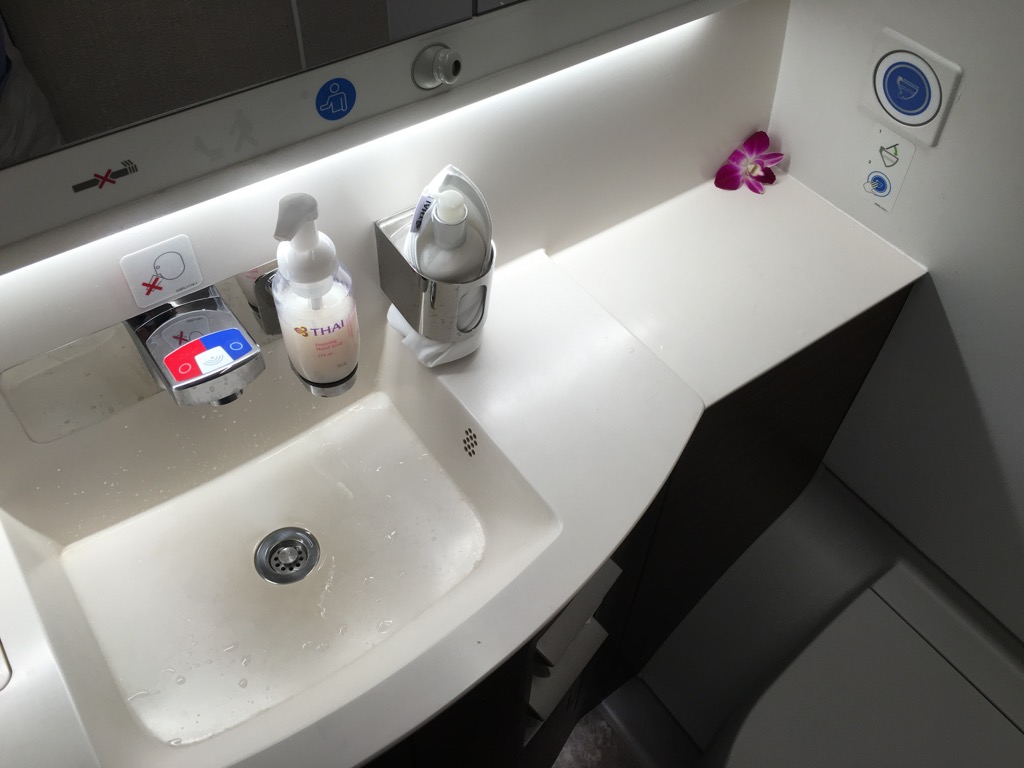 Noch vor dem Start habe ich mir meinen Pyjama angezogen. Die Waschräume im Thai Airbus A350 sind zwar nicht besonders groß, dennoch habe ich schon deutlich kleinere Waschräume in Flugzeugen gesehen.