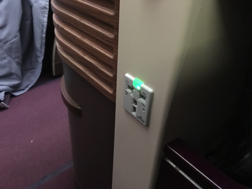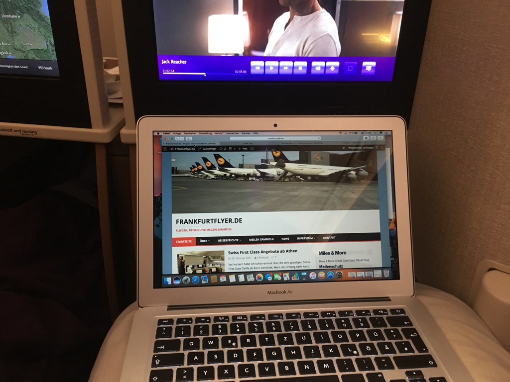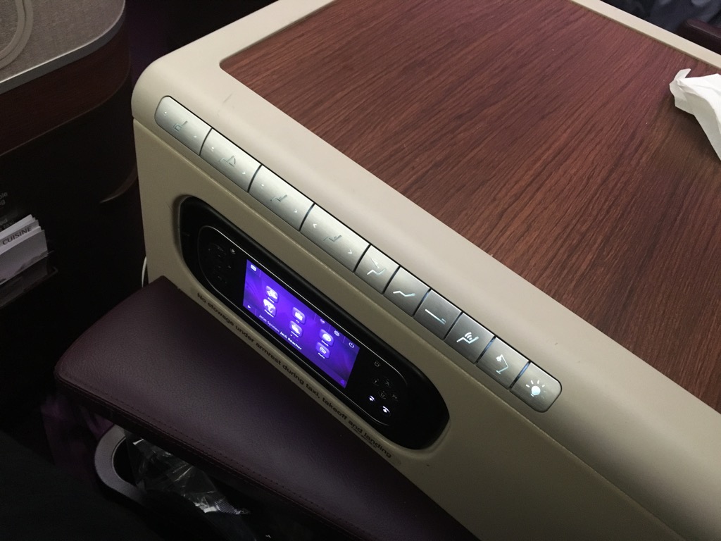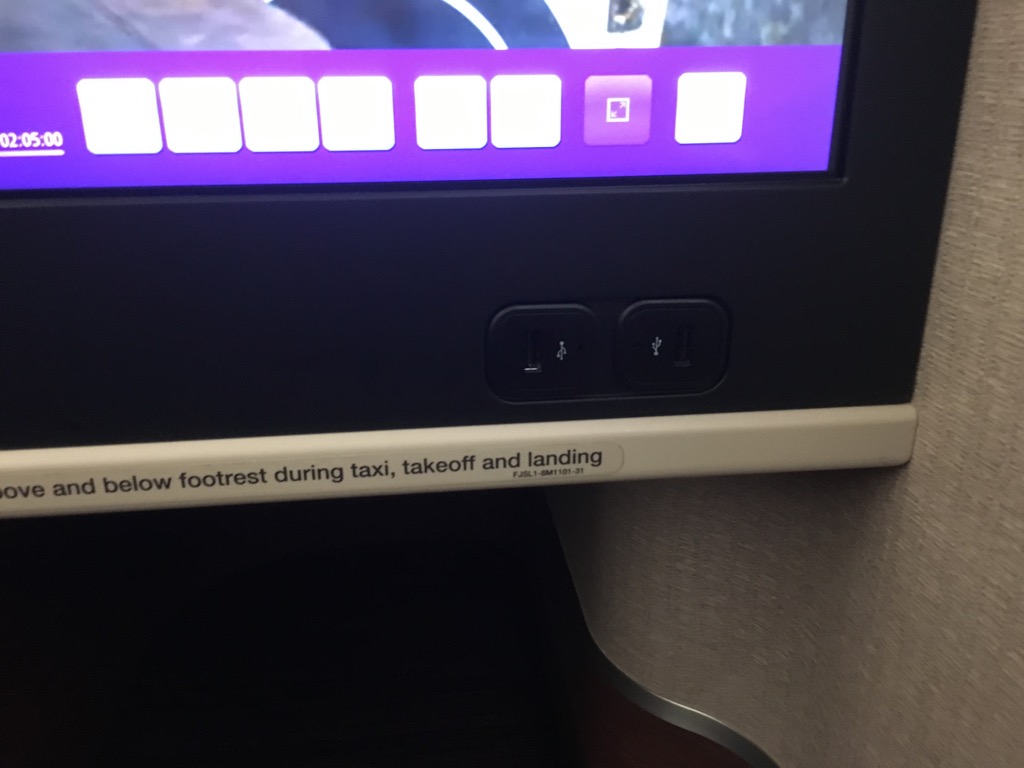 Die Sitzsteuerung befindet sich in der Seitenarmlehne über dem Controller für das IFE. Was mir persönlich extrem positiv aufgefallen ist, waren die zwei USB Ports am Bildschirm, zusätzlich zu der 110 Volt Steckdose.