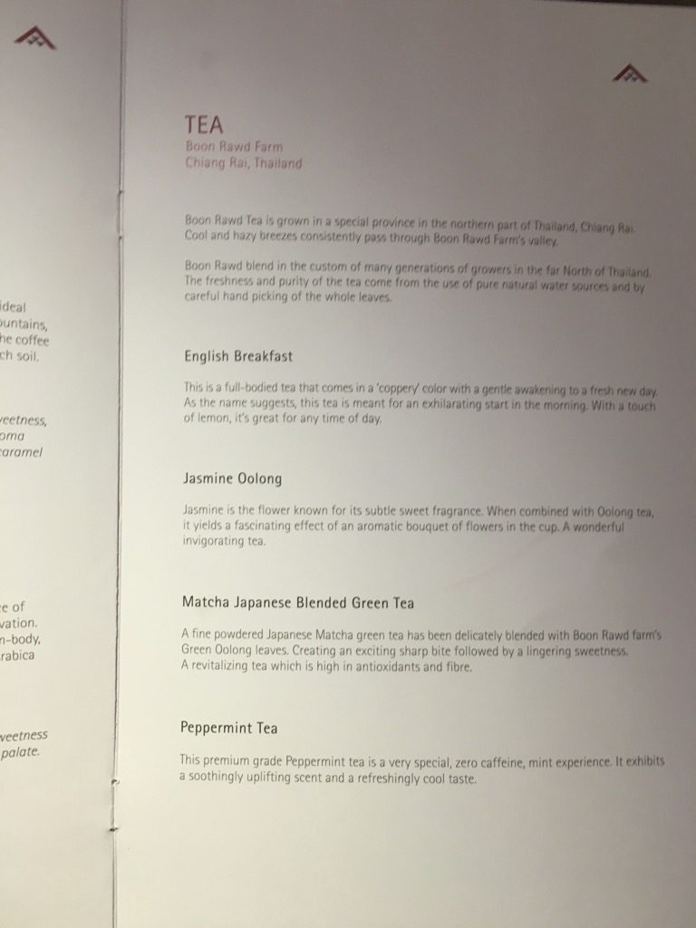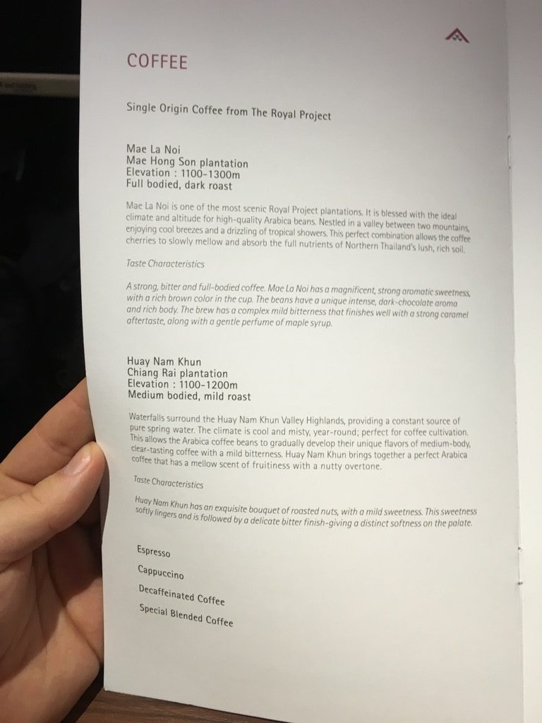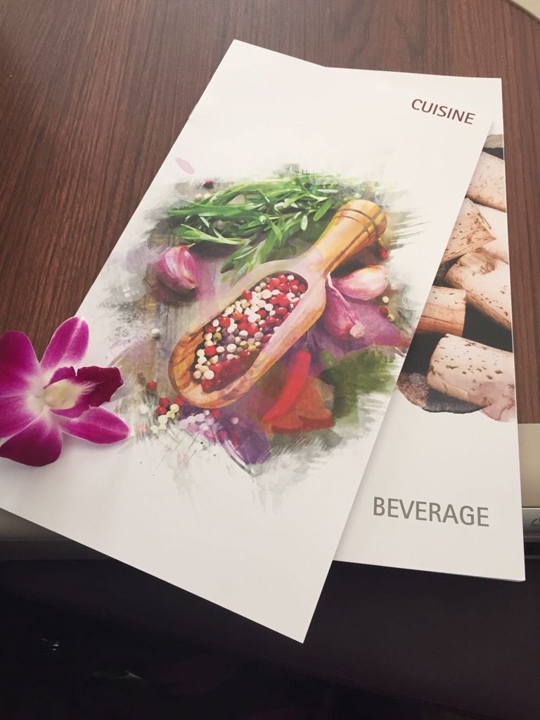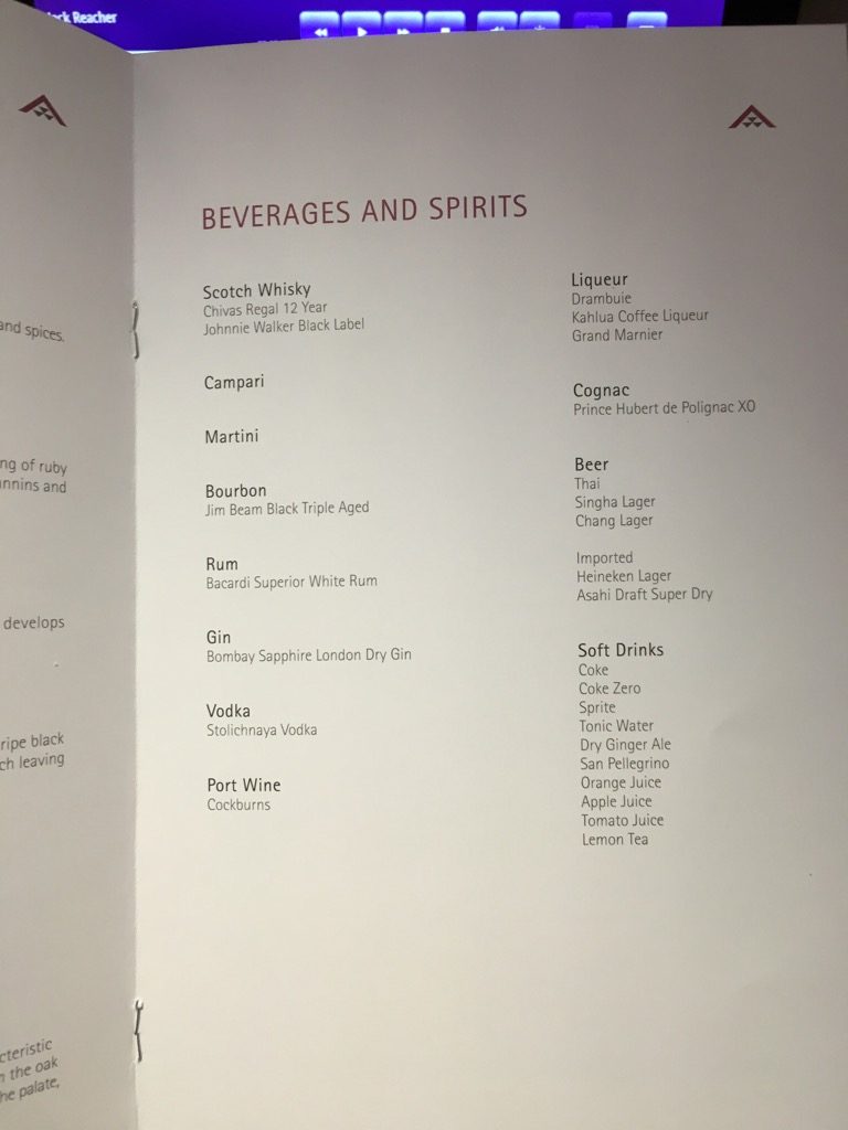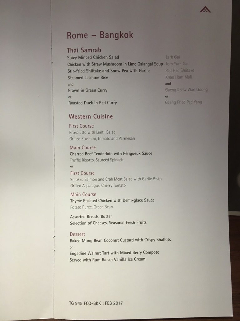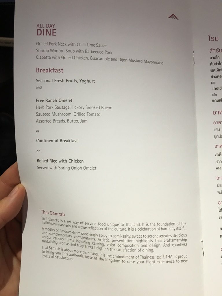 Auch die Speisekarten wurden bereits am Boden verteilt und die Essenswünsche abgefragt. Thai serviert entweder ein thailändisches Menü, oder ein westliches Menü. Dabei kann man interessanterweise nicht die thailändische Vorspeise mit einem westlichen Hauptgang kombinieren. Vermutlich, da bei dem Thai Essen Vor- und Hauptspeise zusammen serviert werden.