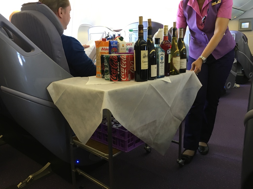 Nachdem alle Tablets mit den Vorspeisen und Nüssen verteilt waren, wurde ein Barwagen in die Kabine geschoben. Dieses Konzept hat mir grundsätzlich gut gefallen und hier erübrigte sich auch eine Getränkekarte, da man sieht was angeboten wird.