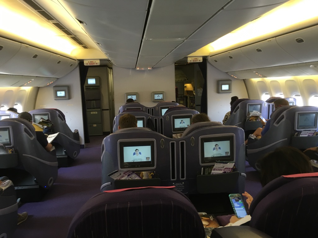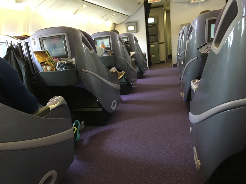 Die Business Class der Thai Airways Boeing 777-200 besteht aus nur 30 lie-flat Sitzen in einer 2-2-2 Anordnung. Dies ist in einer Boeing 777 eine durchaus großzügige Anordnung. Daher waren die Gänge in der Thai Boeing 777-200 wohl auch die breitesten, welche ich je in einem Flugzeug gesehen habe.
