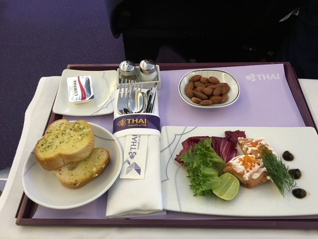 Grundsätzlich mag ich ja einen schnellen Service in der Business Class, allerdings verstehe ich nicht, warum man bei einem Flug mit Abflug vor 10 Uhr so auf die Tube drückt beim Service, wenn doch ein Mittagessen serviert wird. So hat man kurz nach 10 Uhr Ortszeit in Bangkok das Mittagessen im Flieger serviert.