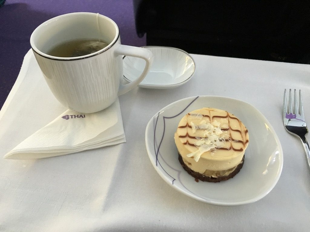 Zum Dessert gab es noch einen Bananekuchen und einen Pfefferminztee für mich. Die Tassen bei Thai sind wohl die größten Tassen aller Airlines. Daher werden diese bei Thai auch meistens nur halb voll serviert.